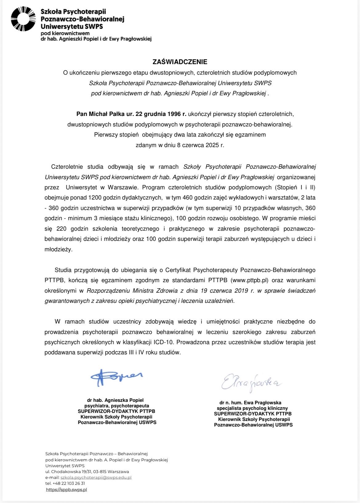Ukończyłem jednolite studia magisterskie na kierunku psychologia (specjalność kliniczna) na Uniwersytecie SWPS we Wrocławiu. Obecnie jestem w trakcie szkolenia psychoterapeutycznego w nurcie poznawczo – behawioralnym (CBT) w Szkole Psychoterapii Poznawczo-Behawioralnej Uniwersytetu SWPS w Poznaniu. Jestem też członkiem Polskiego Towarzystwa Terapii Poznawczej