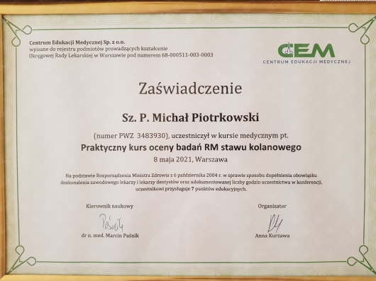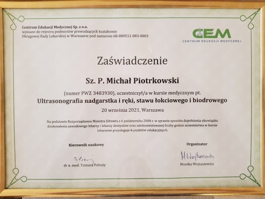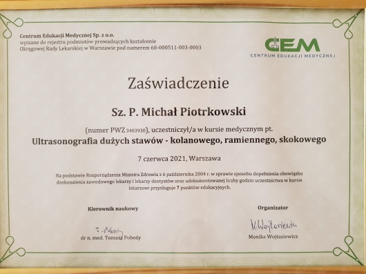 Jaki jest zakres porad oferowanych przez Michał Piotrkowski?Michał Piotrkowski to w trakcie specjalizacji (ortopeda). Na podstawie swojego doświadczenia i wykształcenia Michał Piotrkowski oferuje usługi takie jak: konsultacja ortopedyczna, konsultacja ortopedyczna + USG.