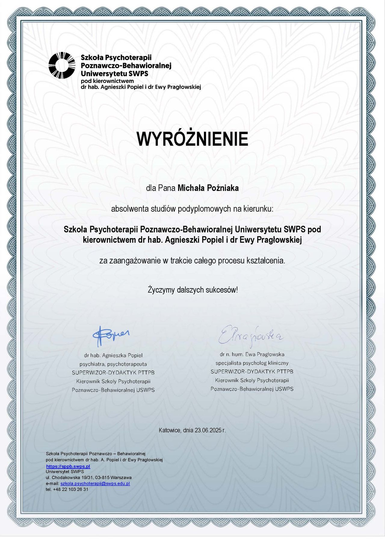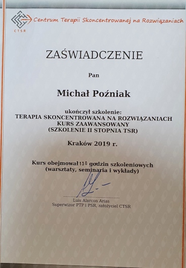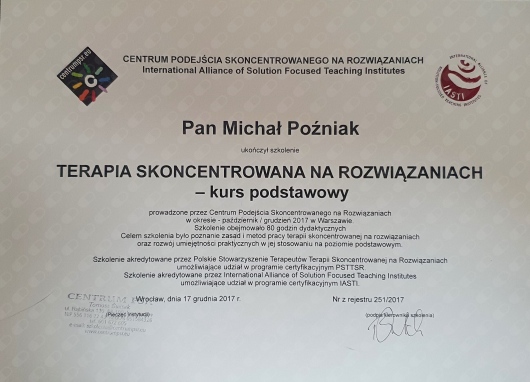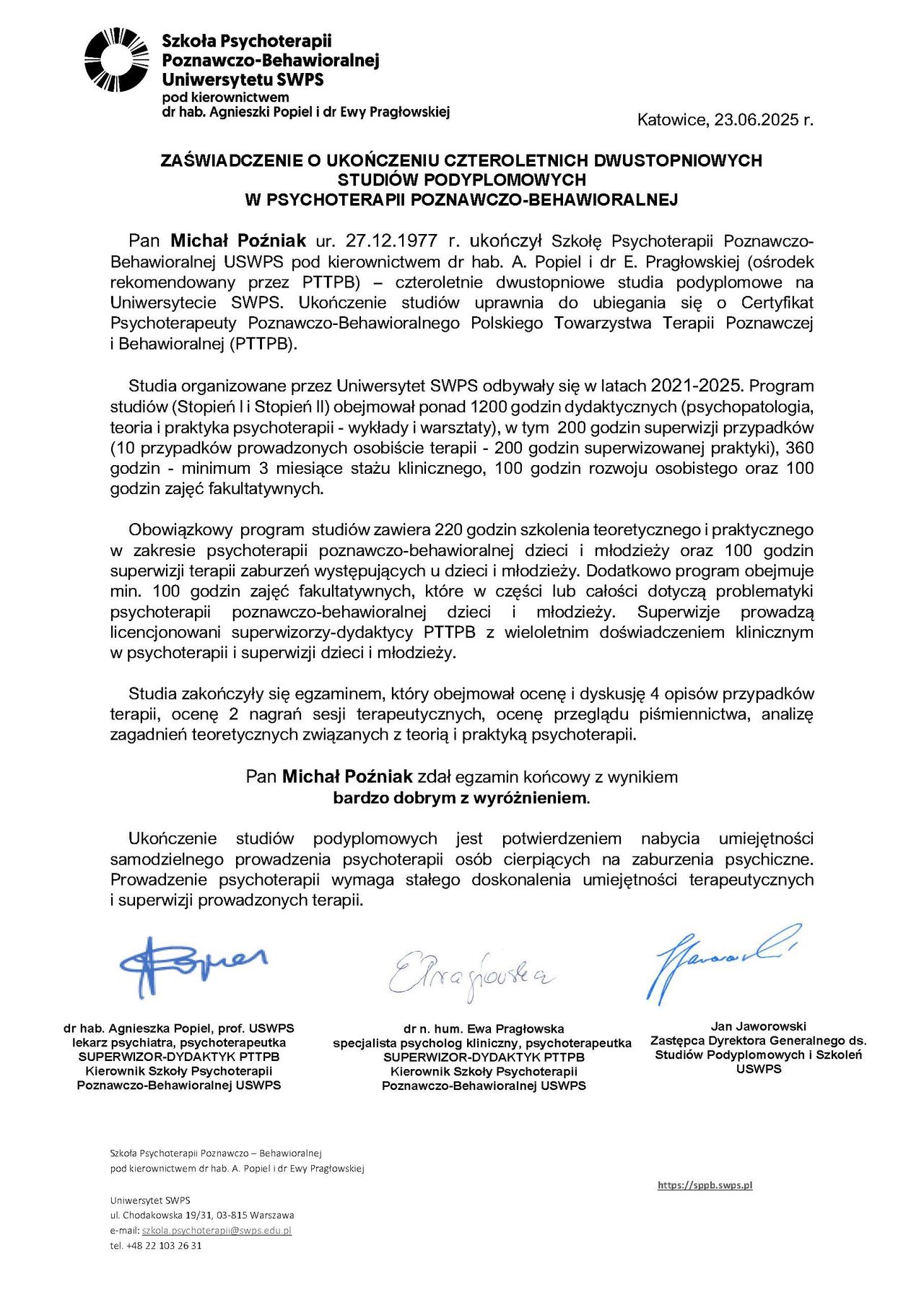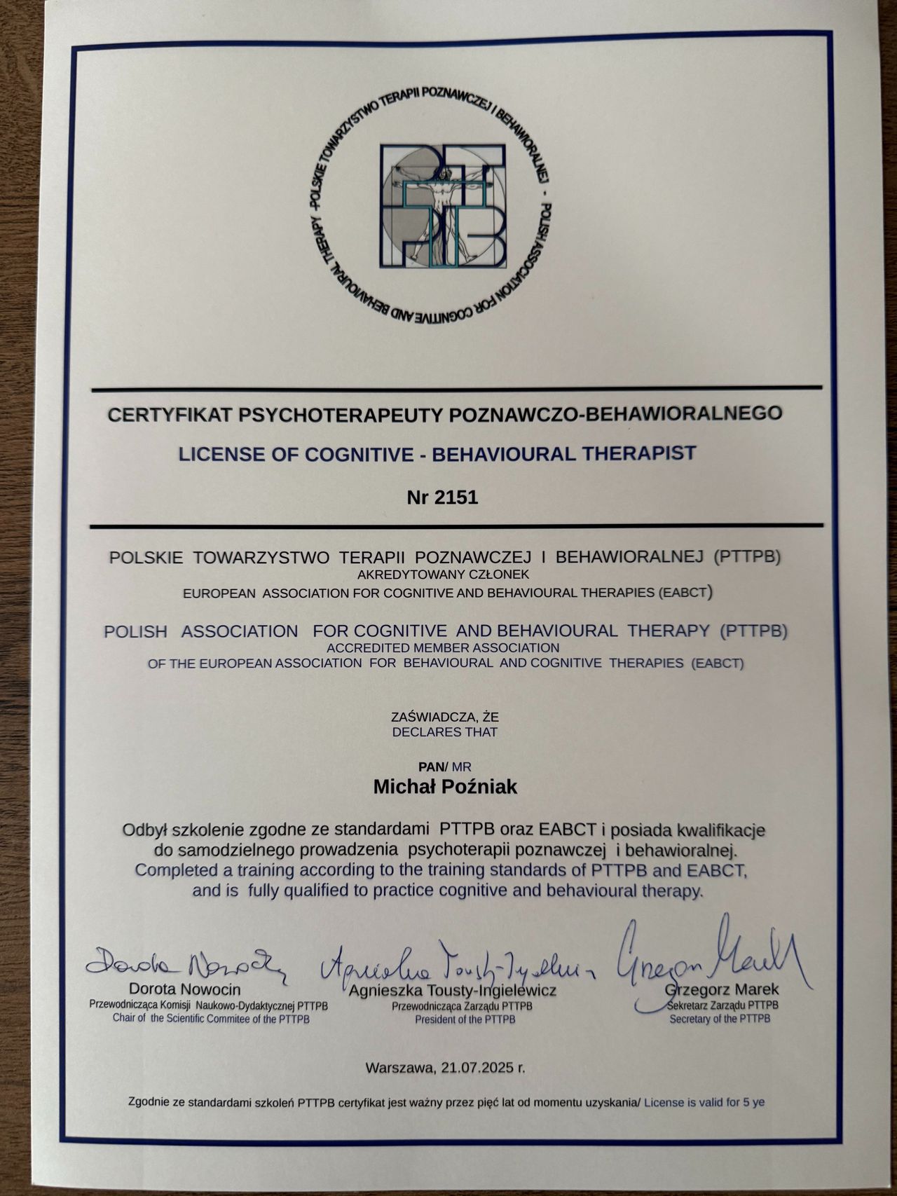 Witam Państwa na mojej stronie. Jestem psychologiem, certyfikowanym psychoterapeutą poznawczo-behawioralnym Certyfikat Psychoterapeuty poznawczo-behawioralnego PTTPB nr 2151 i seksuologiem. Wspólnie z moimi Klientami buduję rozwiązania, które podnoszą jakość ich życia. Kieruję się przede wszystkim akceptacją i zrozumieniem celów, świata i wartości moich Klientów. W 2004 roku ukończyłem studia z zakresu psychologii na Uniwersytecie Śląskim. Od tego czasu zajmuję się pracą rozwojową i terapeutyczną. Umiejętności terapeutyczne rozwijałem podczas szkoleń i warsztatów prowadzonych przez uznanych polskich terapeutów. Ukończyłem z wynikiem bardzo dobrym Seksuologię Kliniczną na Uniwersytecie SWPS. Rozwijałem się w zakresie pracy w nurcie Terapii Skoncentrowanej na Rozwiązaniach oraz Racjonalnej Terapii Zachowania. Swoją pracę poddaję stałej superwizji doświadczonych terapeutów. Ukończyłem z wyróżnieniem Studia Podyplomowe z Psychoterapii w Szkole Psychoterapii Poznawczo-Behawioralnej SWPS. Nie jestem lekarzem, więc nie wystawiam recept.