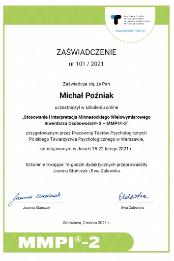 Jaki jest zakres porad oferowanych przez Michał Poźniak?Michał Poźniak to psychoterapeuta certyfikowany, seksuolog, psycholog. Na podstawie swojego doświadczenia i wykształcenia Michał Poźniak oferuje usługi takie jak: psychoterapia indywidualna, Konsultacja psychologiczna, konsultacja seksuologiczna, psychoterapia par.