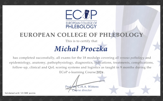 W 2024 roku uzyskał Europejski Certyfikat Flebologiczny wydawany przez European College of Phlebology.