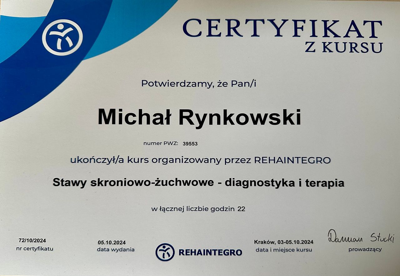 Pan Michał pracował kiedyś w Jagielloni i swoją wiedzę ekspercką przenosi na pacjentów w gabinecie. Super skuteczny i kompetentny. Już po pierwszej wizycie odnotowałem znaczną poprawę w zakresie kolana.