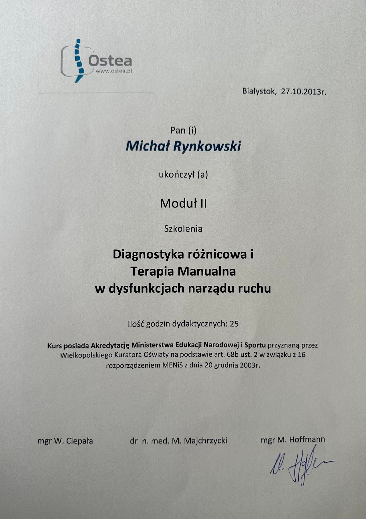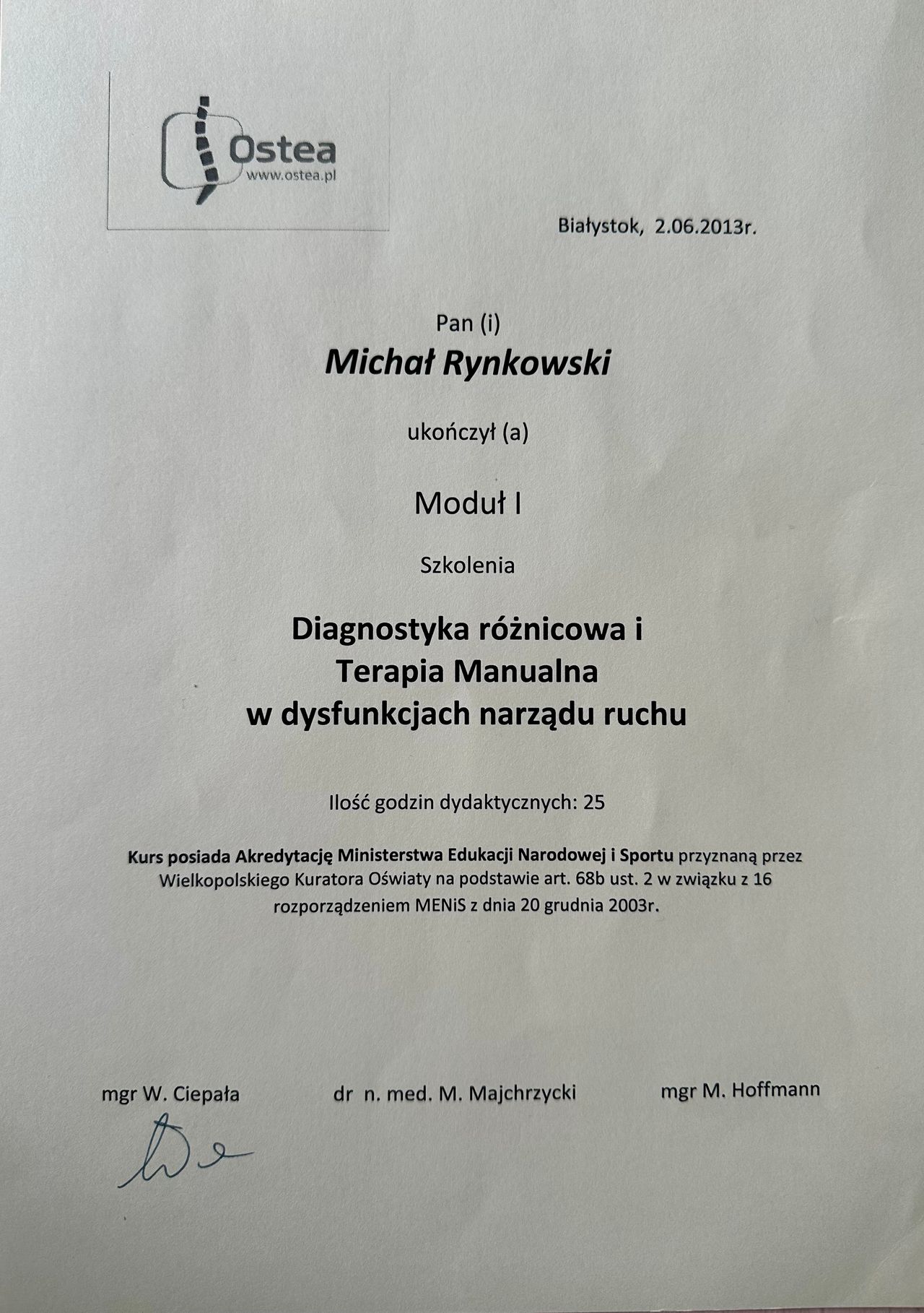 - kilkuletnie doświadczenie zdobyte w białostockich poradniach rehabilitacyjnych (Centrum Medyczne „Hansa”, Centrum Medyczne „Vita Med”
