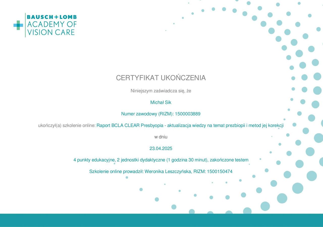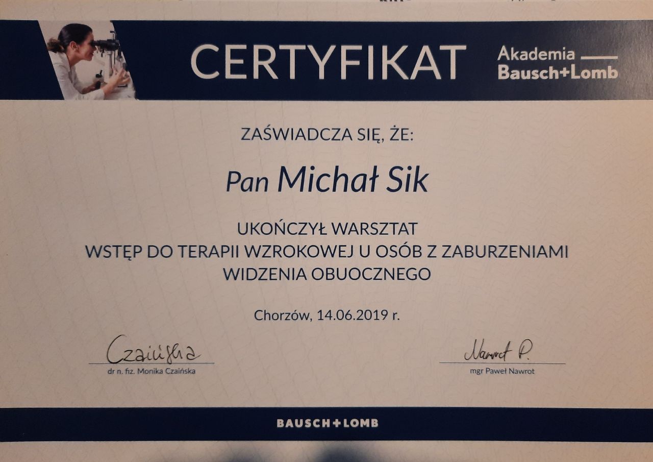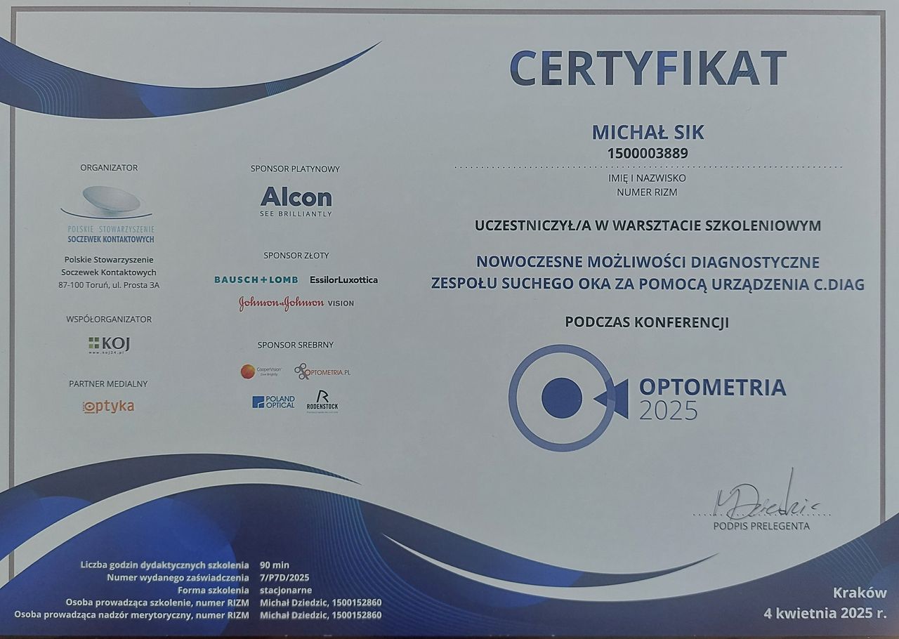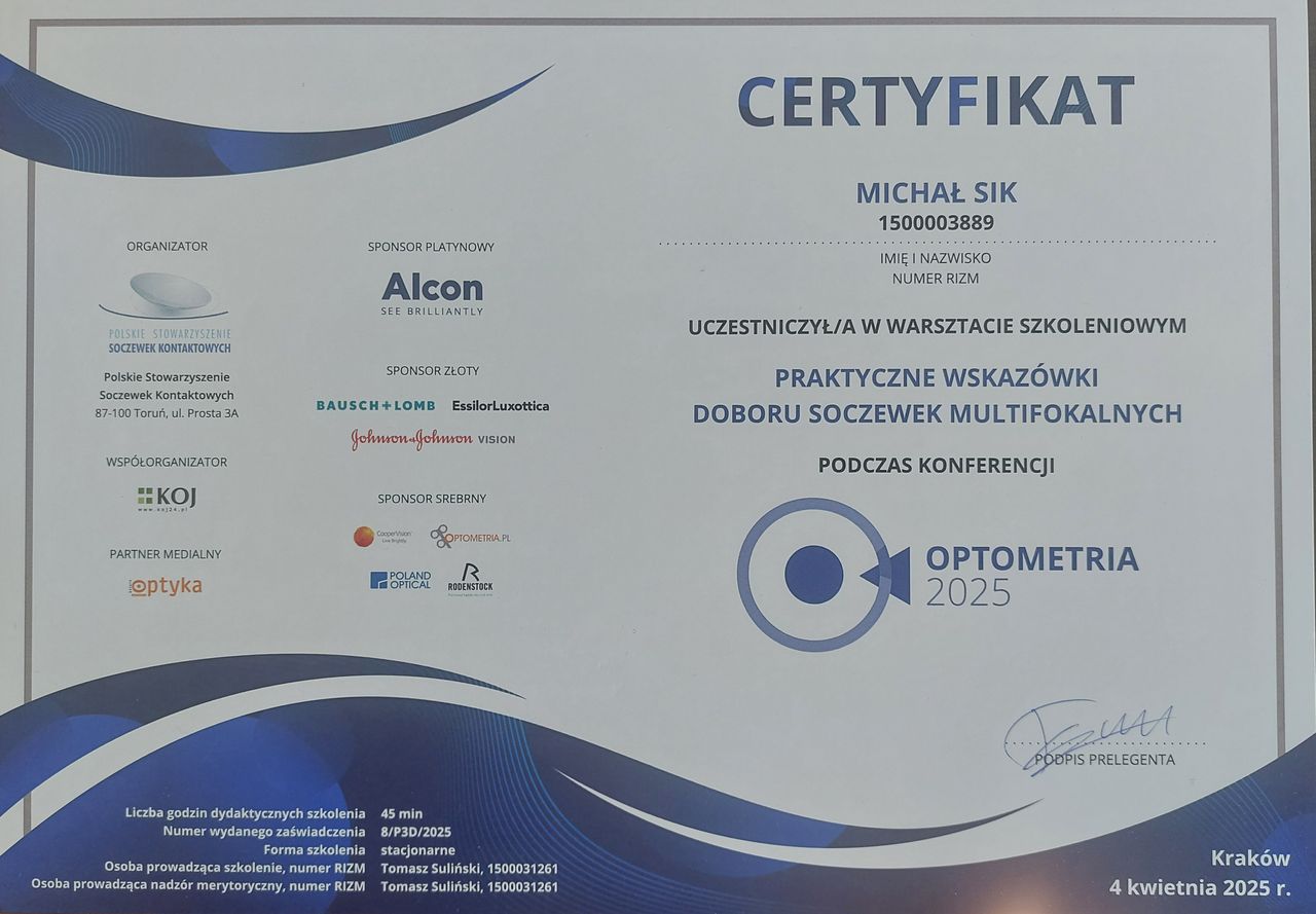 Jaki jest zakres porad oferowanych przez Michał Sik?Michał Sik to optometrysta. Na podstawie swojego doświadczenia i wykształcenia Michał Sik oferuje usługi takie jak: Konsultacja optometryczna, dobór wartości korekcji u dorosłych, dobór soczewek kontaktowych miękkich.