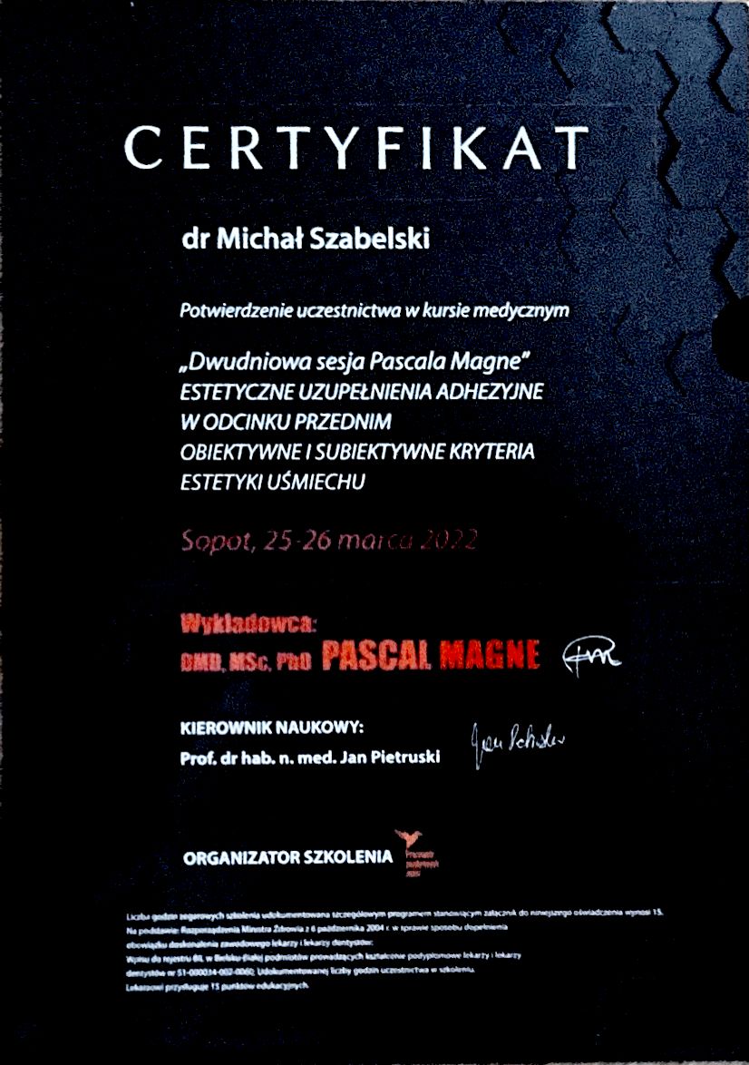 Pierwszy raz trafiłem do Pana Doktora Michała Szabelskiego w nagłej sprawie związanej z pęknięciem drutu retencyjnego, zakładanego wiele lat temu w innej klinice. Po konsultacji telefonicznej Doktor przyjął mnie w trybie pilnym w swoim gabinecie, sprawnie wymienił drut, podzielił się również swoją opinią dotyczącą aktualnego stanu wykonanej niegdyś korekcji zgryzu. Przedstawił plan na dalsze leczenie z wykorzystaniem najnowszych technik. Od tamtego czasu jestem stałym pacjentem Pana Doktora, czy to w sprawach nagłych, czy w ramach regularnego leczenia. Dzięki świetnemu podejściu do pacjenta można czuć się komfortowo przez całą wizytę i opuścić gabinet zadowolonym, z jeszcze ładniejszym uśmiechem!