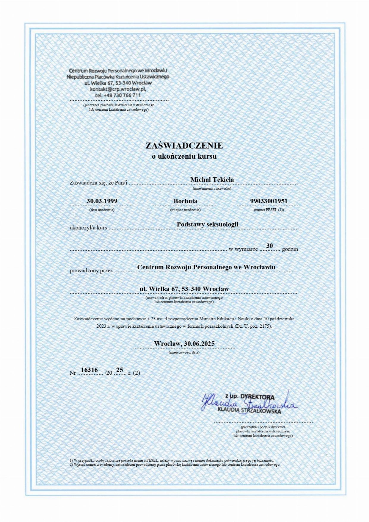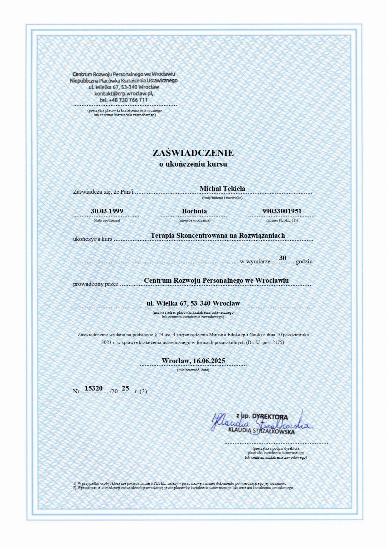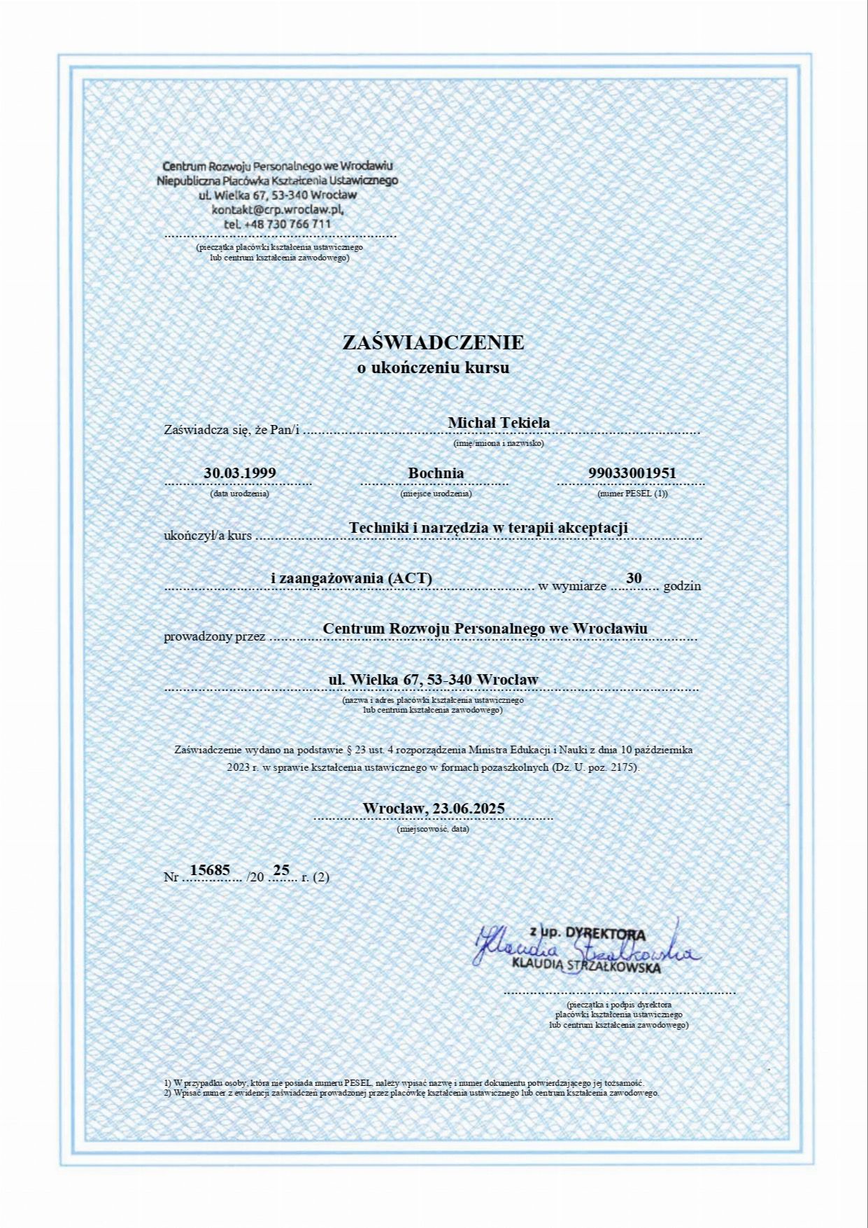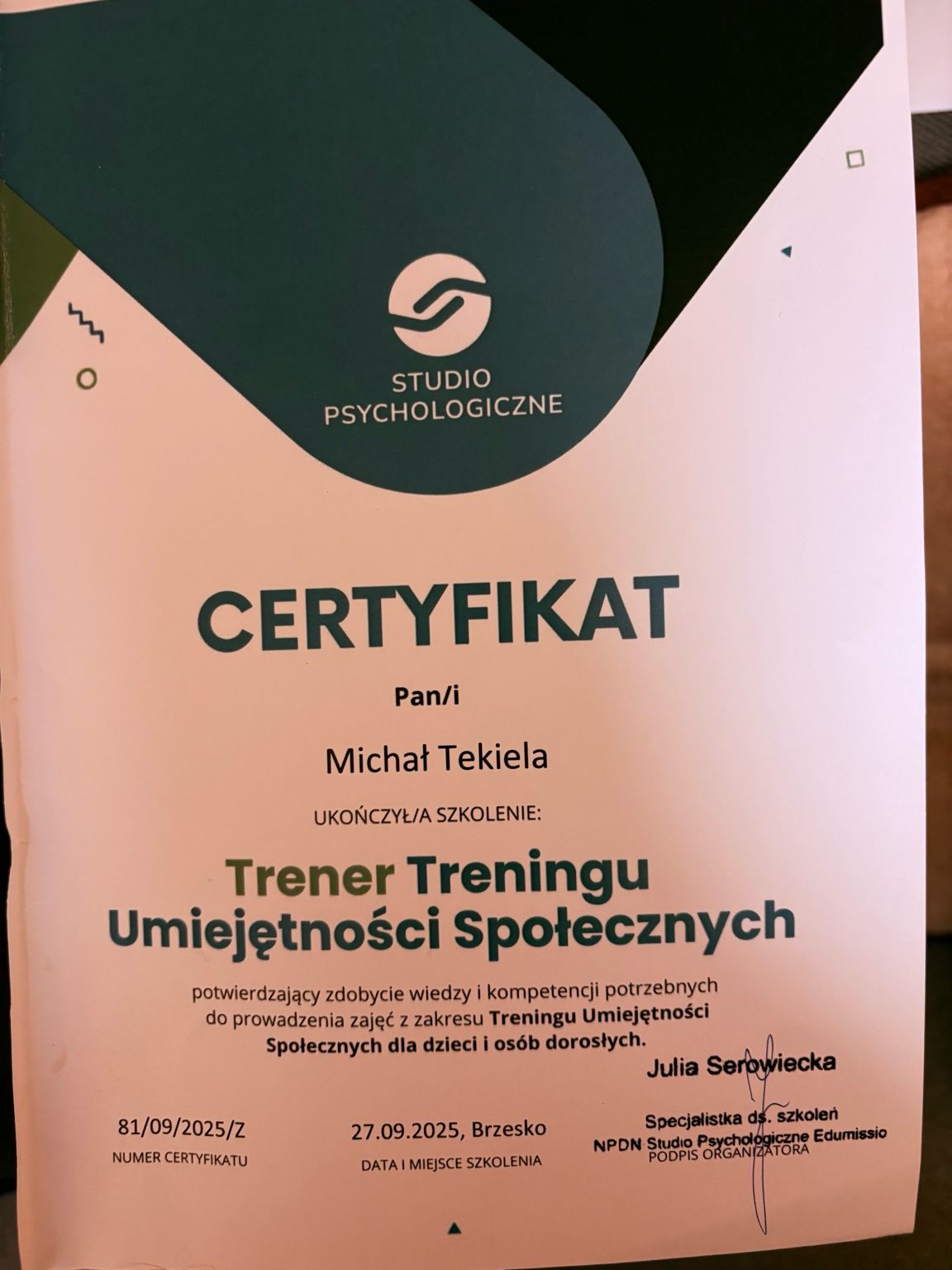 Obecnie jestem w trakcie całościowego szkolenia psychoterapeutycznego w nurcie poznawczo-behawioralnym (CBT) oraz studiów podyplomowych z psychotraumatologii. Posiadam również kwalifikacje Trenera Umiejętności Społecznych (TUS) I i II stopnia.