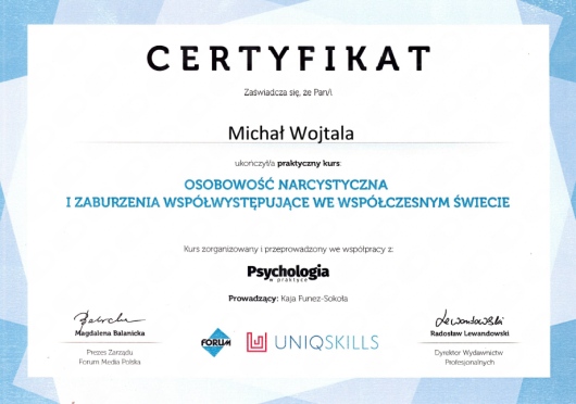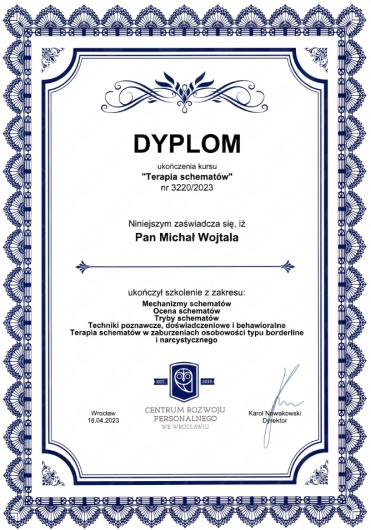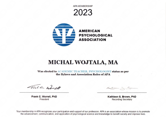 Jako członek prestiżowych towarzystw naukowych, takich jak Amerykańskie Towarzystwo Psychologiczne (APA) oraz Europejskie Stowarzyszenie Psychologii Klinicznej i Leczenia Psychologicznego (EACLIPT), stale podnoszę swoje kompetencje, uczestnicząc w szkoleniach i konferencjach z zakresu diagnozy i terapii psychologicznej. Ponadto prowadzę szkolenia z zakresu psychopatologii i diagnozy psychologicznej, dzieląc się swoją wiedzą i doświadczeniem z innymi specjalistami.