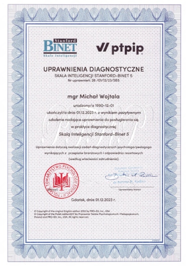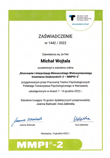 Jaki jest zakres porad oferowanych przez Michał Wojtala?Michał Wojtala to psycholog, psycholog dziecięcy, psychotraumatolog. Na podstawie swojego doświadczenia i wykształcenia Michał Wojtala oferuje usługi takie jak: test inteligencji, ADOS-2 - diagnoza autyzmu u dzieci, młodzieży i dorosłych, Badanie ADOS - 2, Badanie inteligencji, Badanie MMPI-2, badanie neuropsychologiczne, Diagnostyka i opinia dla osób transpłciowych, Diagnoza ADHD, diagnoza ADHD dla dorosłych, diagnoza ADHD dla dziecka.