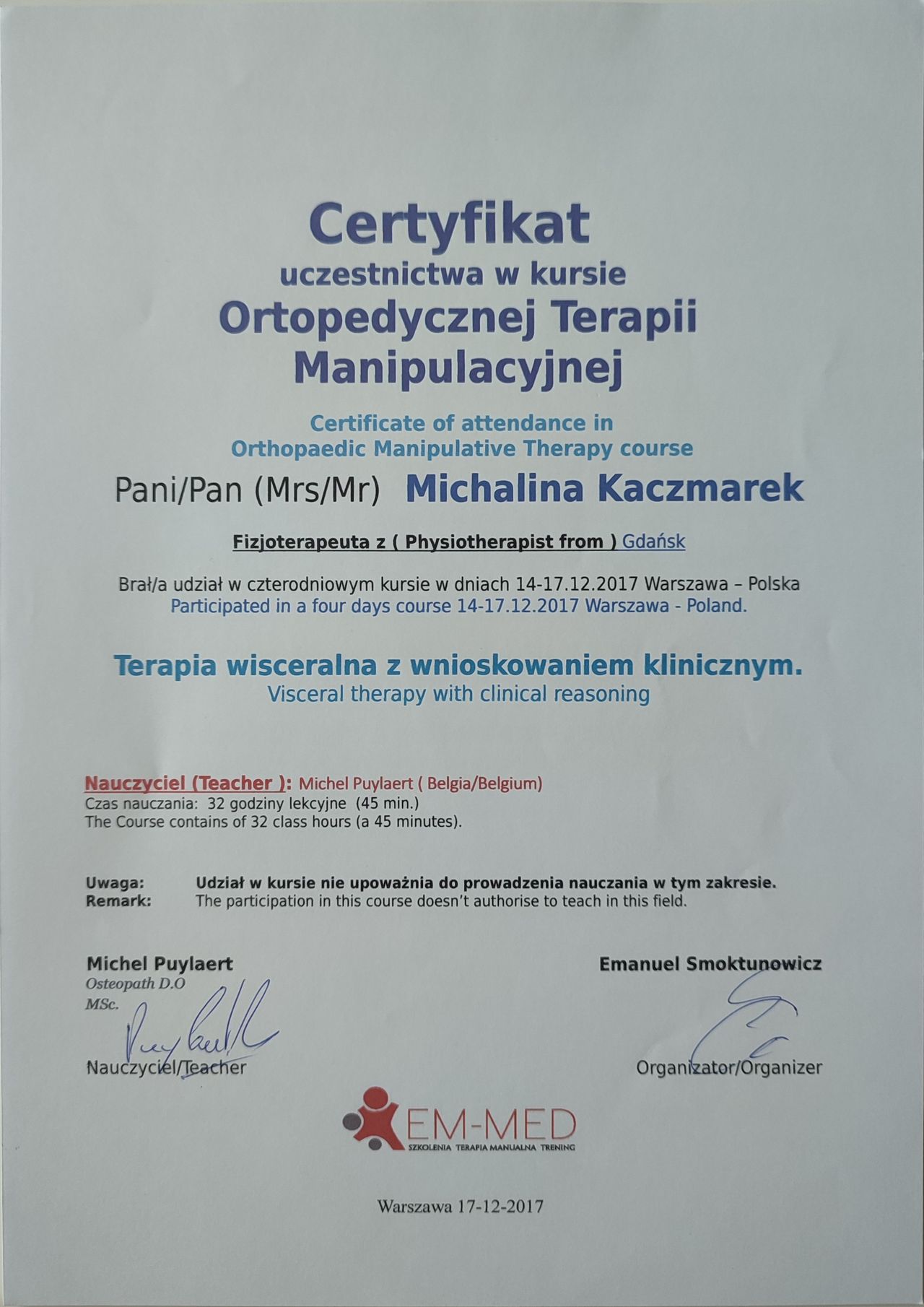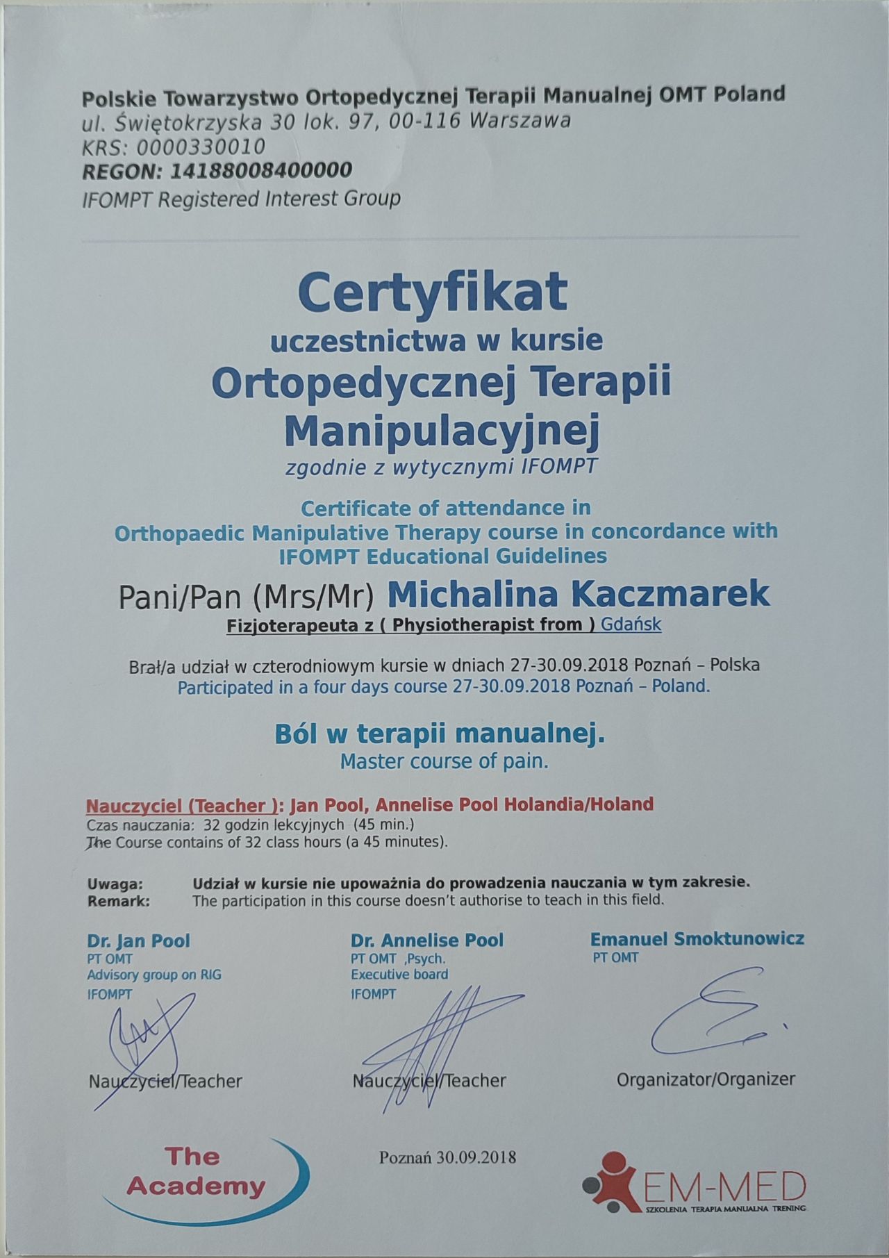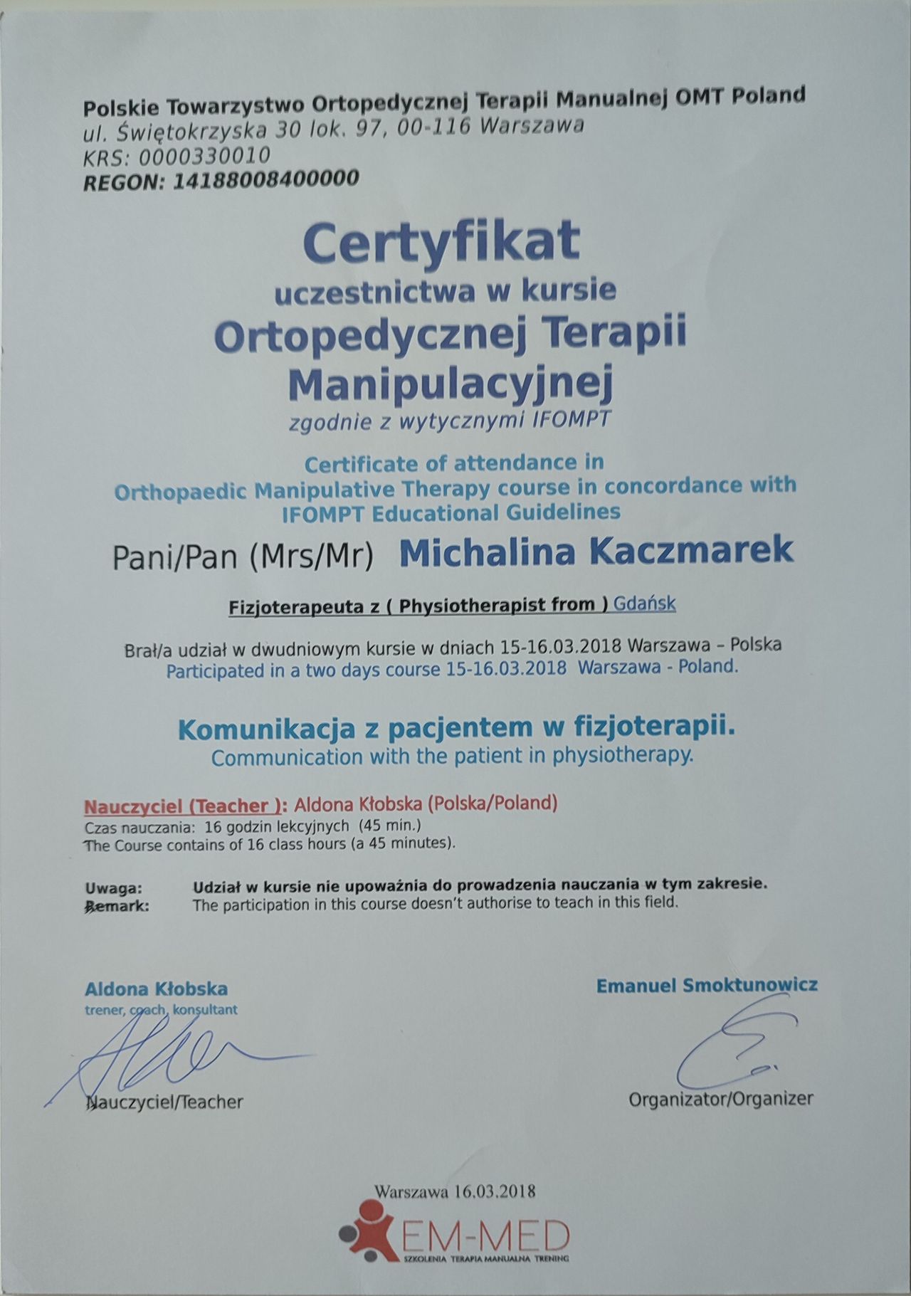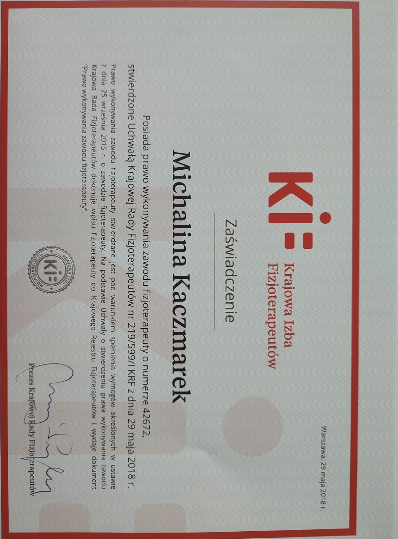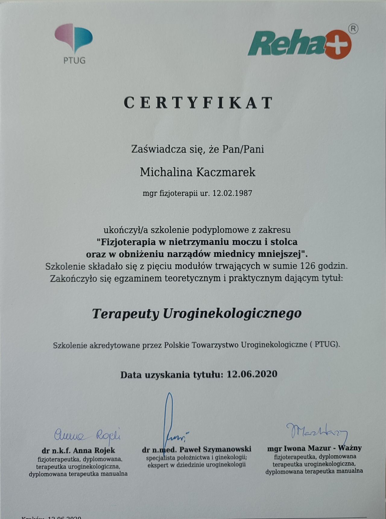 Jaki jest zakres porad oferowanych przez Michalina Kaczmarek?Michalina Kaczmarek to fizjoterapeuta. Na podstawie swojego doświadczenia i wykształcenia Michalina Kaczmarek oferuje usługi takie jak: fizjoterapia uroginekologiczna, konsultacja fizjoterapeutyczna, Terapia tkanek miękkich, terapia rozejścia mięśni prostych brzucha, fizjoterapia kobiet w ciąży / fizjoterapia okołoporodowa, Terapia blizny, Terapia blizny po cesarskim cięciu, Konsultacja uroginekologiczna, fizjoterapia uroginekologiczna (pierwsza wizyta), fizjoterapia uroginekologiczna (kolejna wizyta).