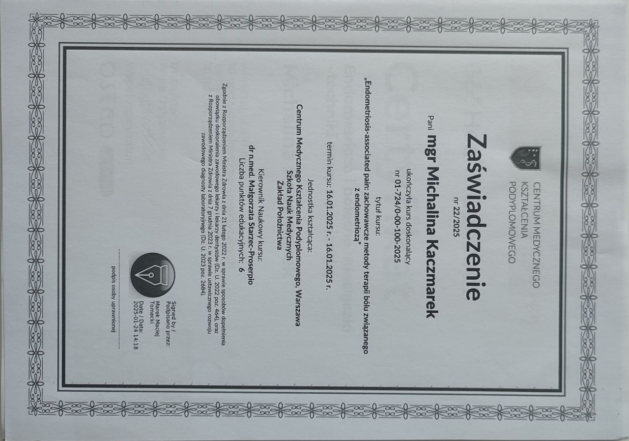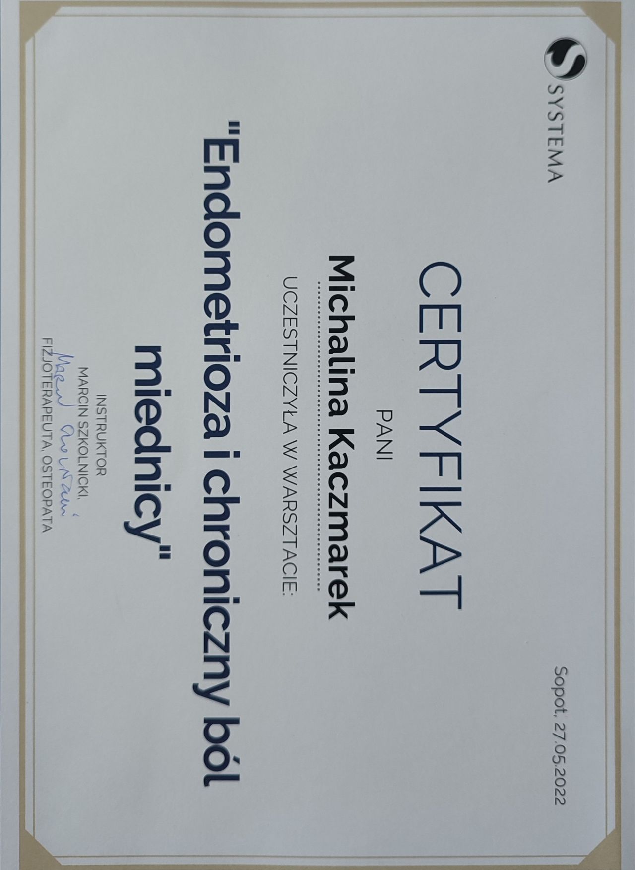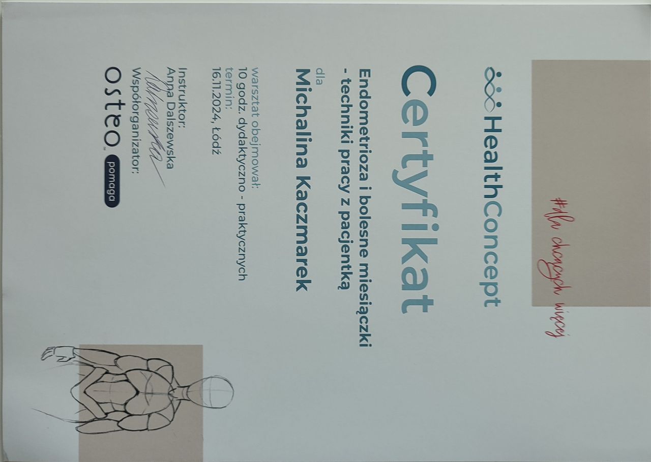 Na mojej drodze z endometriozą spotkałam wiele osób, które powinny mi pomóc - Pani Michalina jest jedną z nielicznych, które faktycznie to zrobiły. Niezwykle życzliwa specjalistka z ogromną i stale poszerzaną wiedzą. Na każdym spotkaniu czułam się zaopiekowana i wysłuchana. Polecam z całego serca zarówno wizyty stacjonarne, jak i obserwowanie social mediów oraz materiały przygotowane przez Panią Michalinę - ebook i nagrania naprawdę pomagają w codzienności :)