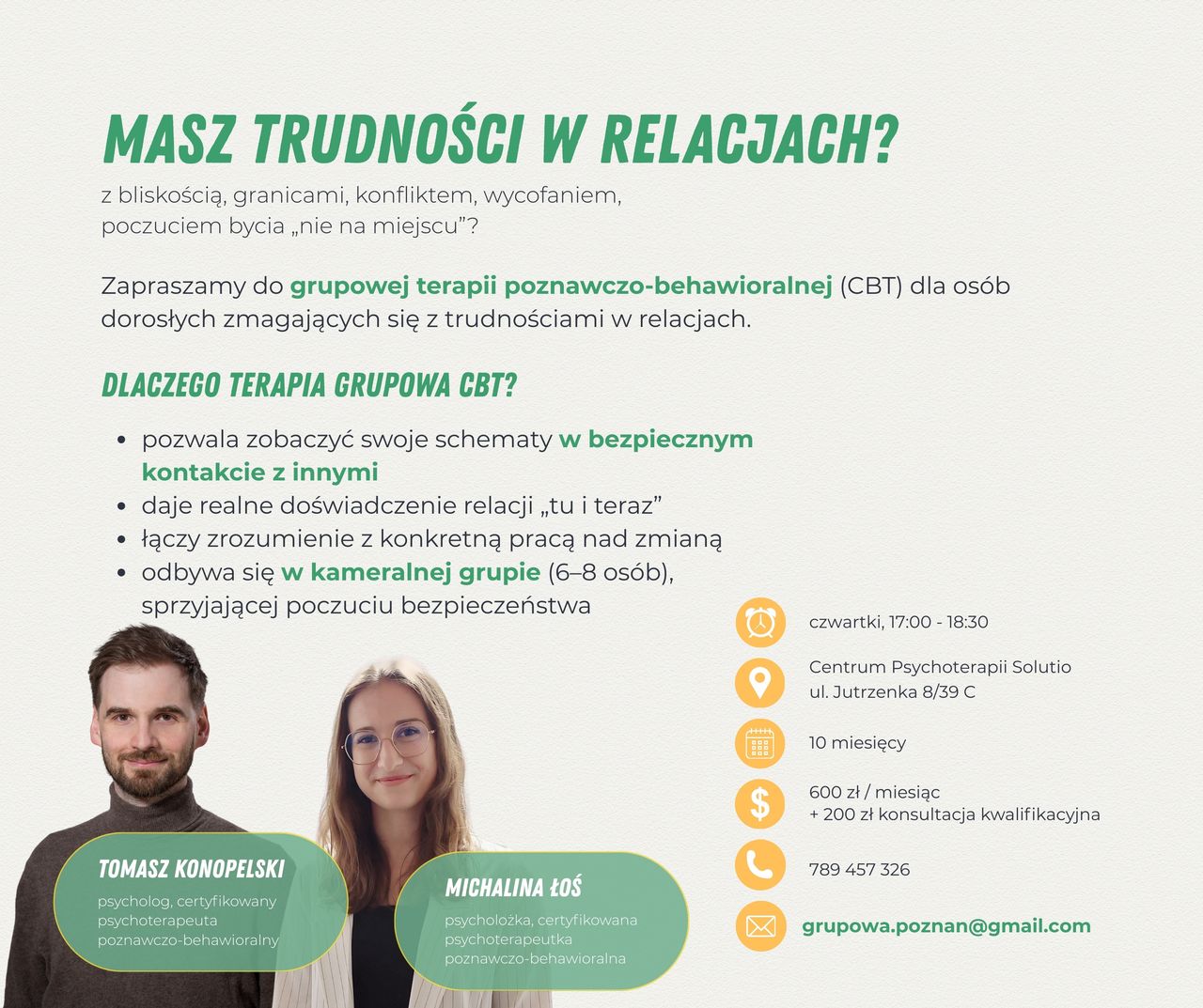 Grupową psychoterapię poznawczo-behawioralną prowadzę wraz z Tomaszem Konopelskim, certyfikowanym terapeutą poznawczo-behawioralnym.