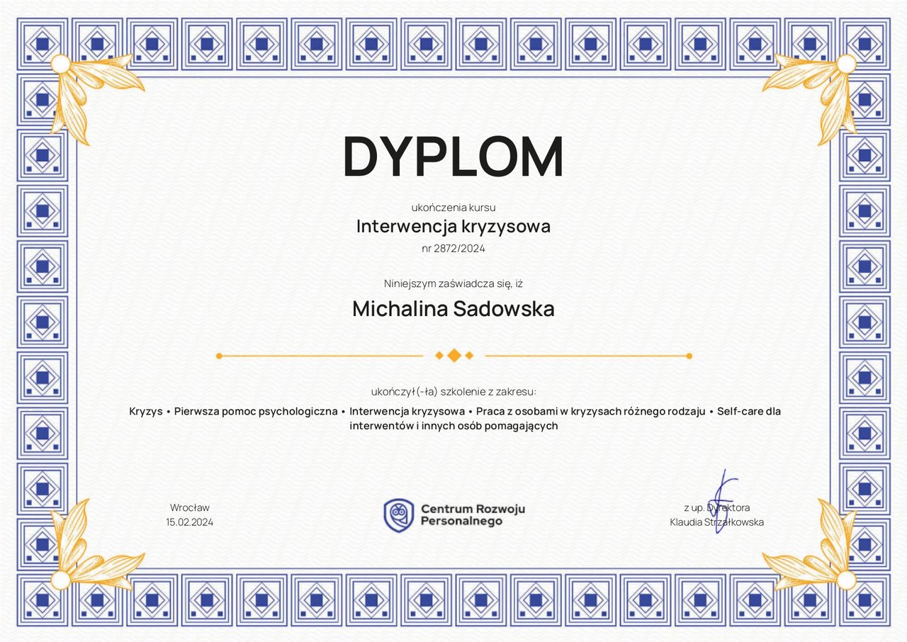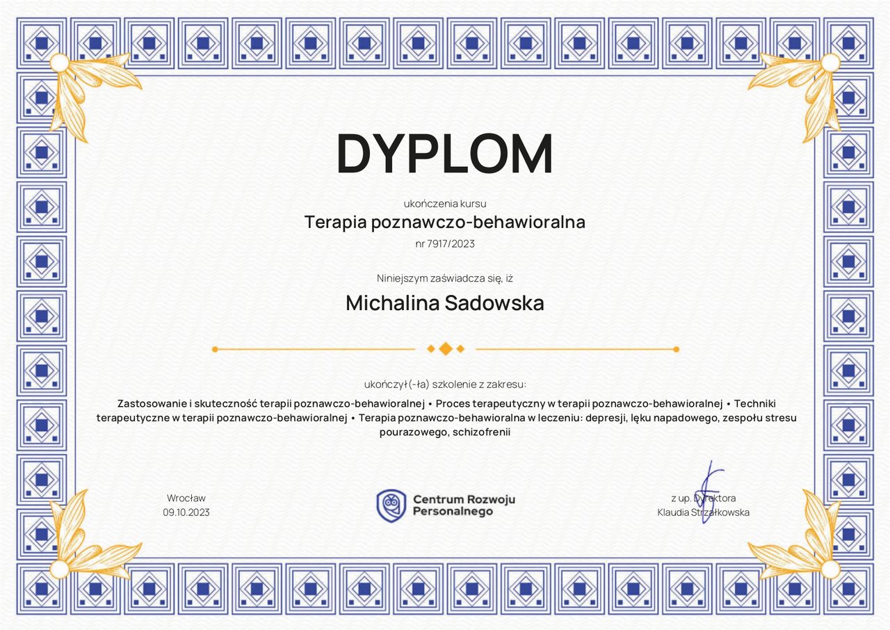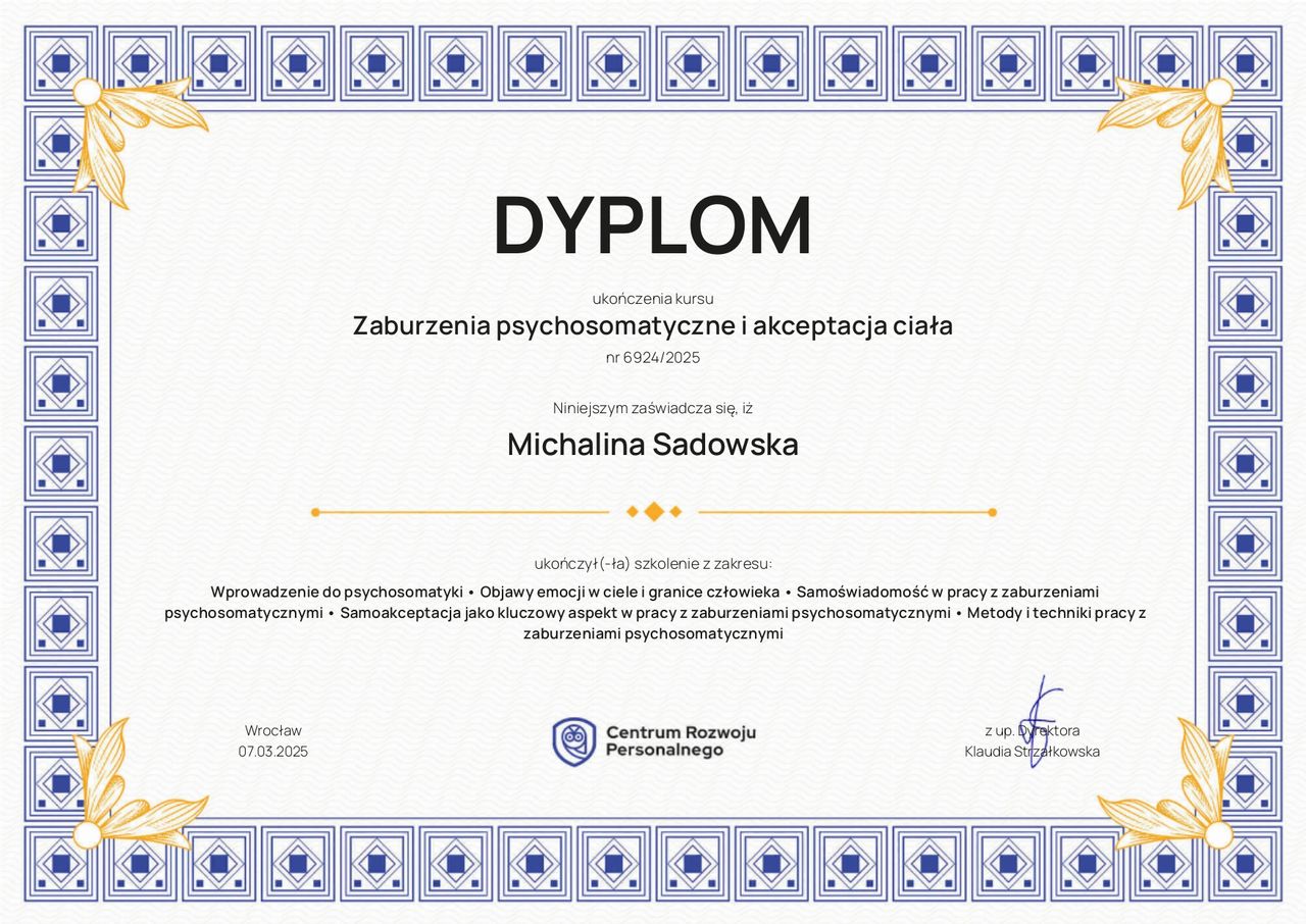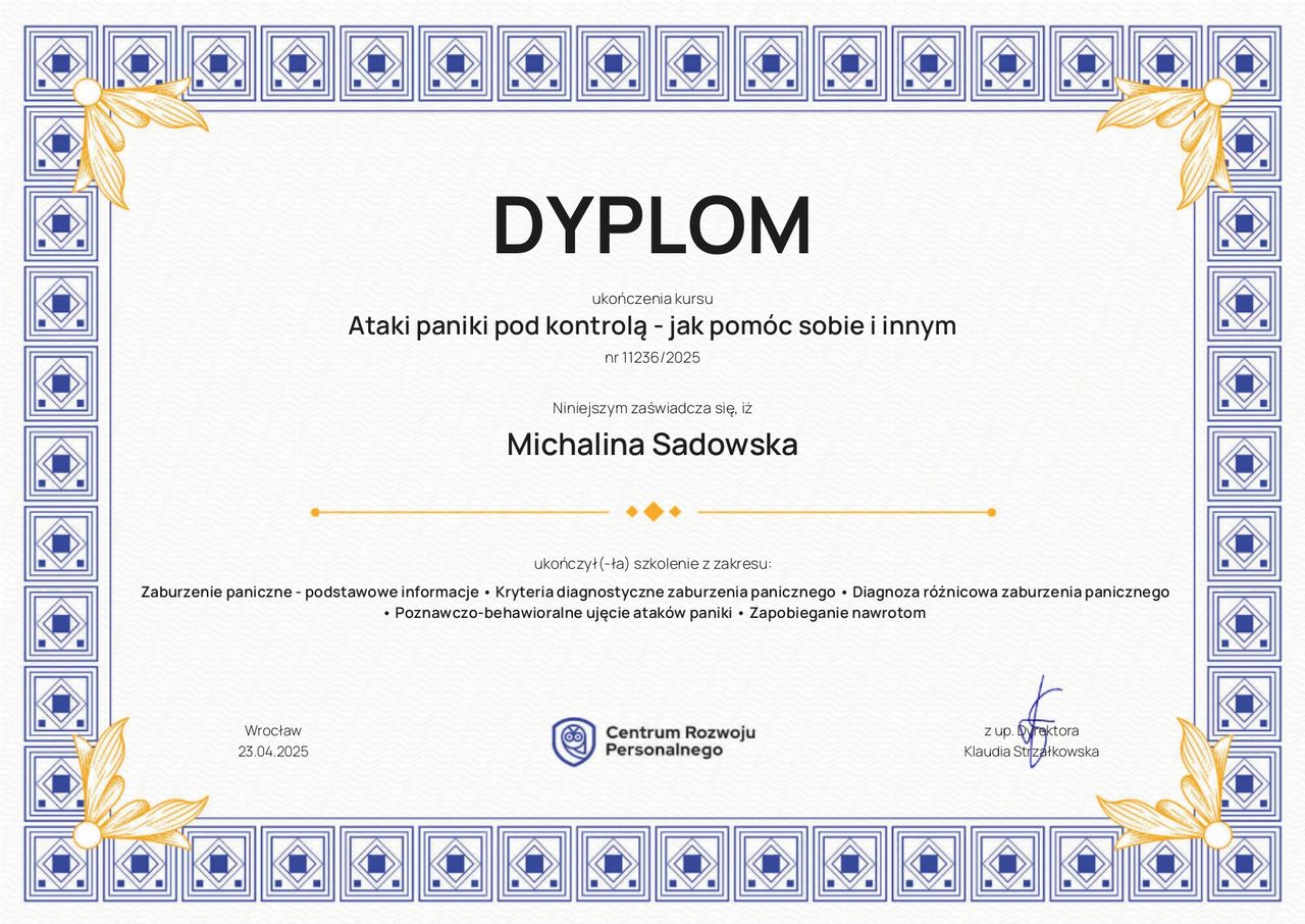 Ukończyłam kurs terapii poznawczo-behawioralnej, kurs terapii schematów, kurs interwencji kryzysowej, kurs z psychosomatyki oraz kurs dotyczący ataków paniki i tego, jak sobie z nimi radzić w Centrum Rozwoju Personalnego we Wrocławiu.