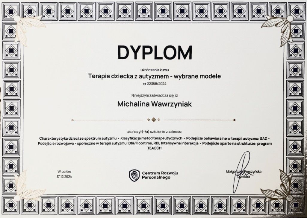 Jestem bardzo zadowolona, córka świetnie się dogadywała z Panią Michaliną i lubiła do niej przychodzić. Na pierwszą wizytę nie chciała w ogóle jechać, na wizycie siedziała obrażona, z każdą kolejną było lepiej i córka się otwierała.