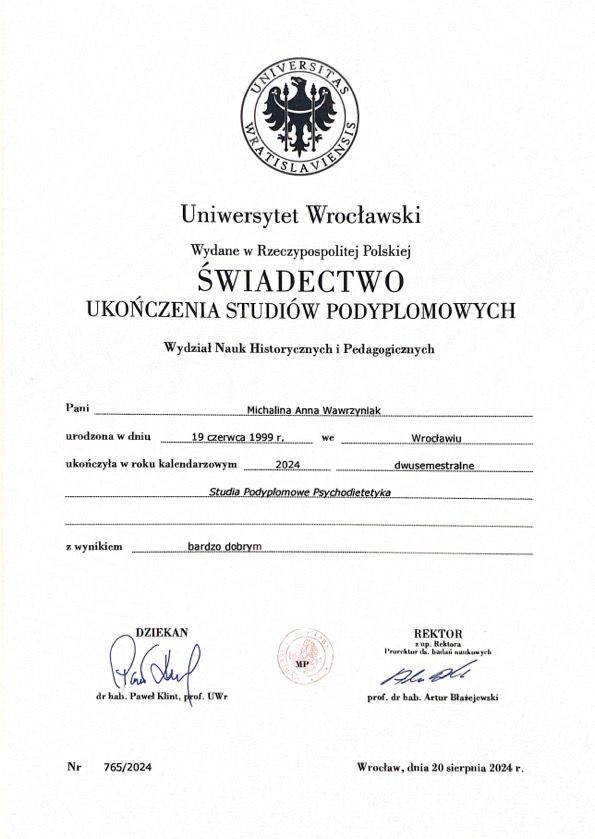 Swoje doświadczenie opieram na odbytych przeze mnie praktykach i wolontariatach, m.in. w Dolnośląskim Centrum Onkologii, Pulmonologii i Hematologii oraz w Szkole Podstawowej nr 68 we Wrocławiu. Obecnie pracuję w ramach programu profilaktycznego dla dzieci i młodzieży „Razem Łatwiej”. W swojej pracy kieruję się zasadami Kodeksu Etycznego Psychologa oraz Kodeksu Etycznego PTTPB.