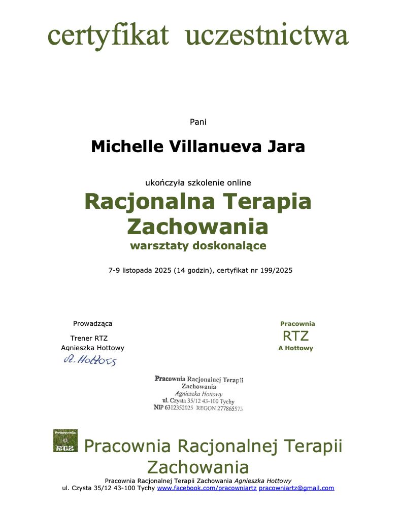 Zdecydowanie polecam Panią Michelle! Profesjonalizm idzie w parze z niesamowitą empatią i cierpliwością. Wizyty są bardzo pomocne, które przynoszą natychmiastową ulgę, konkretne wskazówki oraz potrzebną dawkę motywacji. Bardzo polecam!