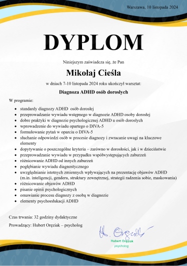 Jaki jest zakres porad oferowanych przez Mikołaj Cieśla?Mikołaj Cieśla to psycholog. Na podstawie swojego doświadczenia i wykształcenia Mikołaj Cieśla oferuje usługi takie jak: diagnoza ADHD dla dorosłych, Konsultacja psychologiczna, ADHD Diagnostic test in english, Konsultacja psychologiczna online.