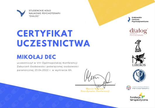 W trakcie terapii Pan Mikołaj wykazał się ponadprzeciętną wiedzą i profesjonalizmem. Nieprzekraczanie granic i trzymanie się etyki zawodowej zapewniło mi poczucie bezpieczeństwa, bez którego terapia z pewnością nie zakończyłaby się sukcesem. Bardzo długo szukałam kompetentnego psychoterapeuty i jestem wdzięczna Panu Mikołajowi za to, że poważnie podchodzi do wykonywanego zawodu! Brawo!
