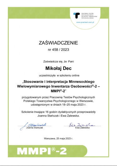 Jaki jest zakres porad oferowanych przez Mikołaj Dec?Mikołaj Dec to psycholog, psychoterapeuta. Na podstawie swojego doświadczenia i wykształcenia Mikołaj Dec oferuje usługi takie jak: psychoterapia indywidualna, konsultacja psychologiczna (kolejna wizyta), konsultacja psychologa terapia psychologiczna, konsultacja psychologiczna (pierwsza wizyta), Psychological consultation follow-up, Konsultacja Wideo - Psychologa pierwszorazowa, Konsultacja Wideo - Psychologa kolejna wizyta, Online consultation - Psychologist First-time visit, test inteligencji, Diagnoza osobowości MMPI.