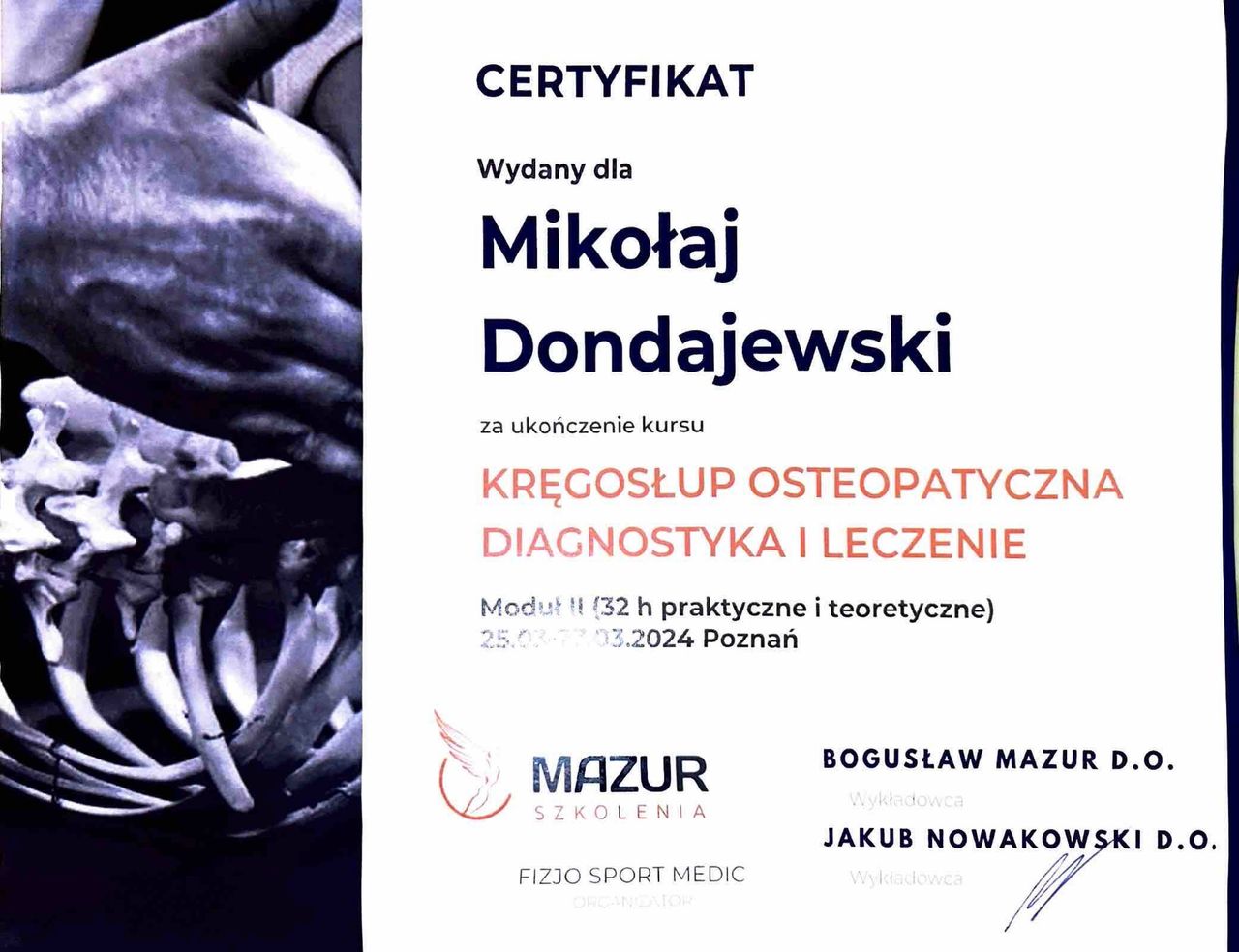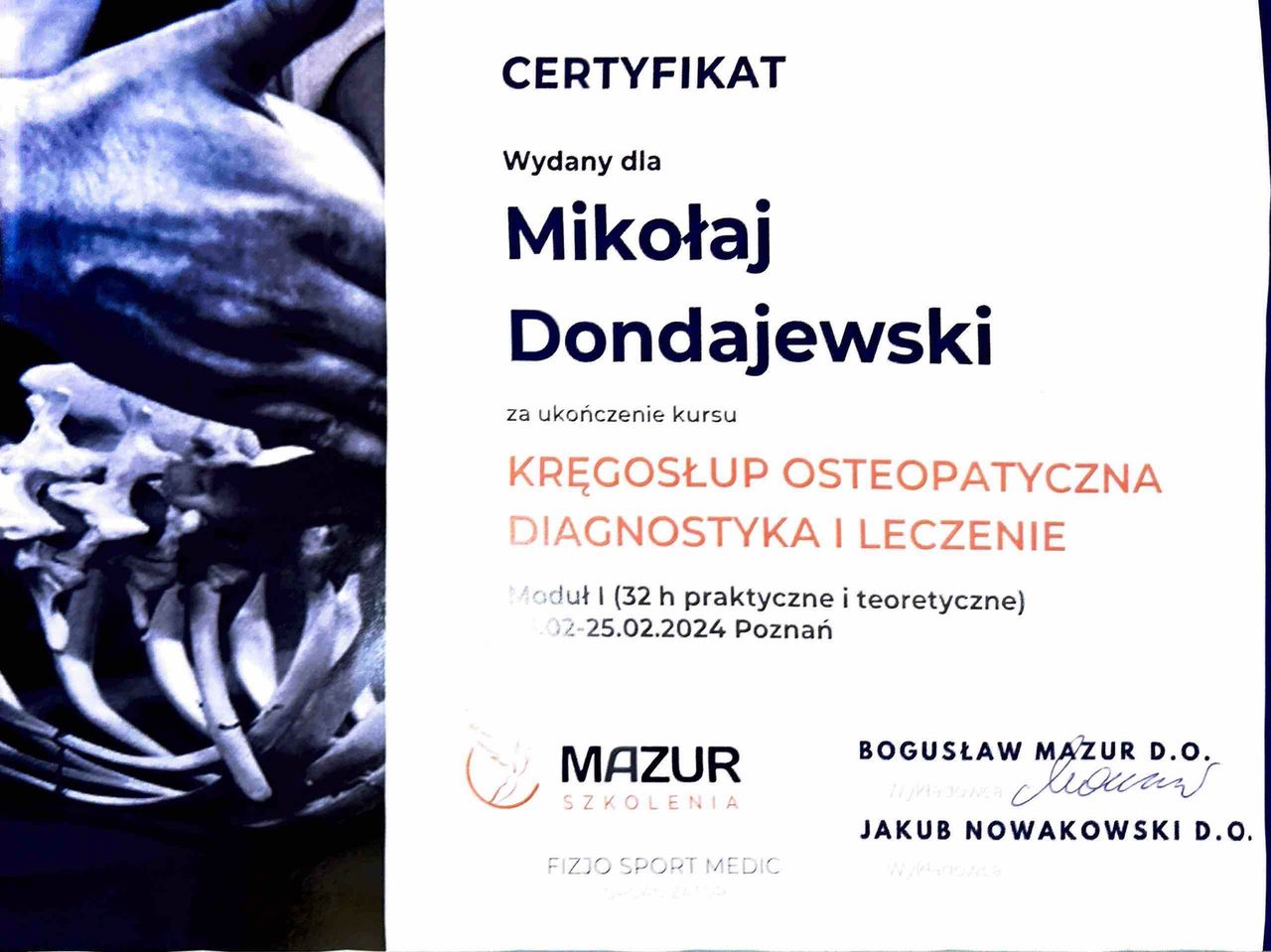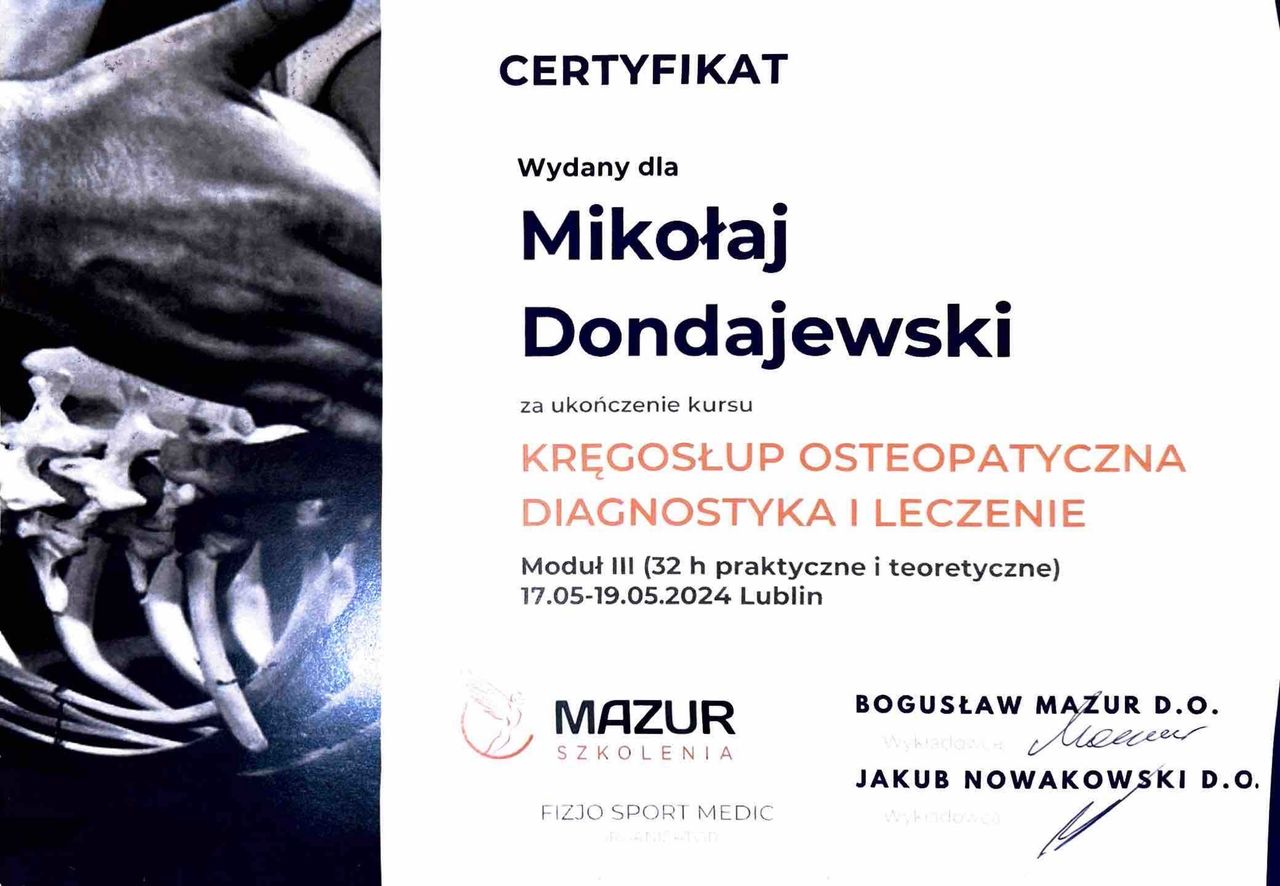Mam na imię Mikołaj, jestem fizjoterapeutą oraz trenerem medycznym. Ukończyłem studia na kierunku fizjoterapia na Uniwersytecie Medycznym w Poznaniu. Brałem udział w licznych szkoleniach z zakresu fizjoterapii, osteopatii i treningu medycznego, a dziś dalej rozwijam się w Akademii Osteopatii w Poznaniu. Ciało ludzkie jest zbyt złożone żeby skupić się na jednym podejściu, dlatego w gabinecie łączę terapię manualną, trening medyczny i osteopatie w jedno spójne podejście, takie które ma naprawdę sens dla pacjenta. Prywatnie jestem pasjonatem biegów górskich i wspinaczki sportowej.