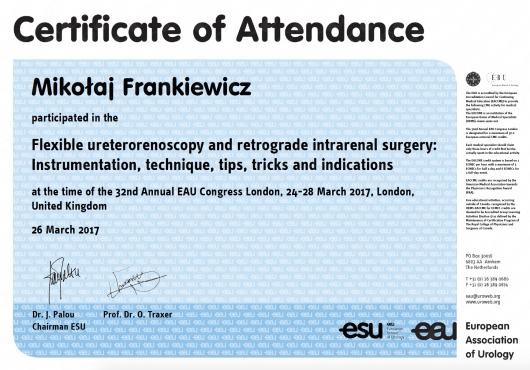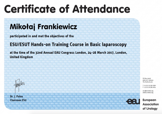 W 2018 roku, dzięki zaproszeniu Europejskiego Towarzystwa Urologicznego, wziąłem dział w szkoleniu urologii minimalnie inwazyjnej "ESU Hands-on Training Course on Laparoscopy and Endourology" przeznaczonym tylko dla 10 rezydentów i specjalistów urologii z całej Europy.
