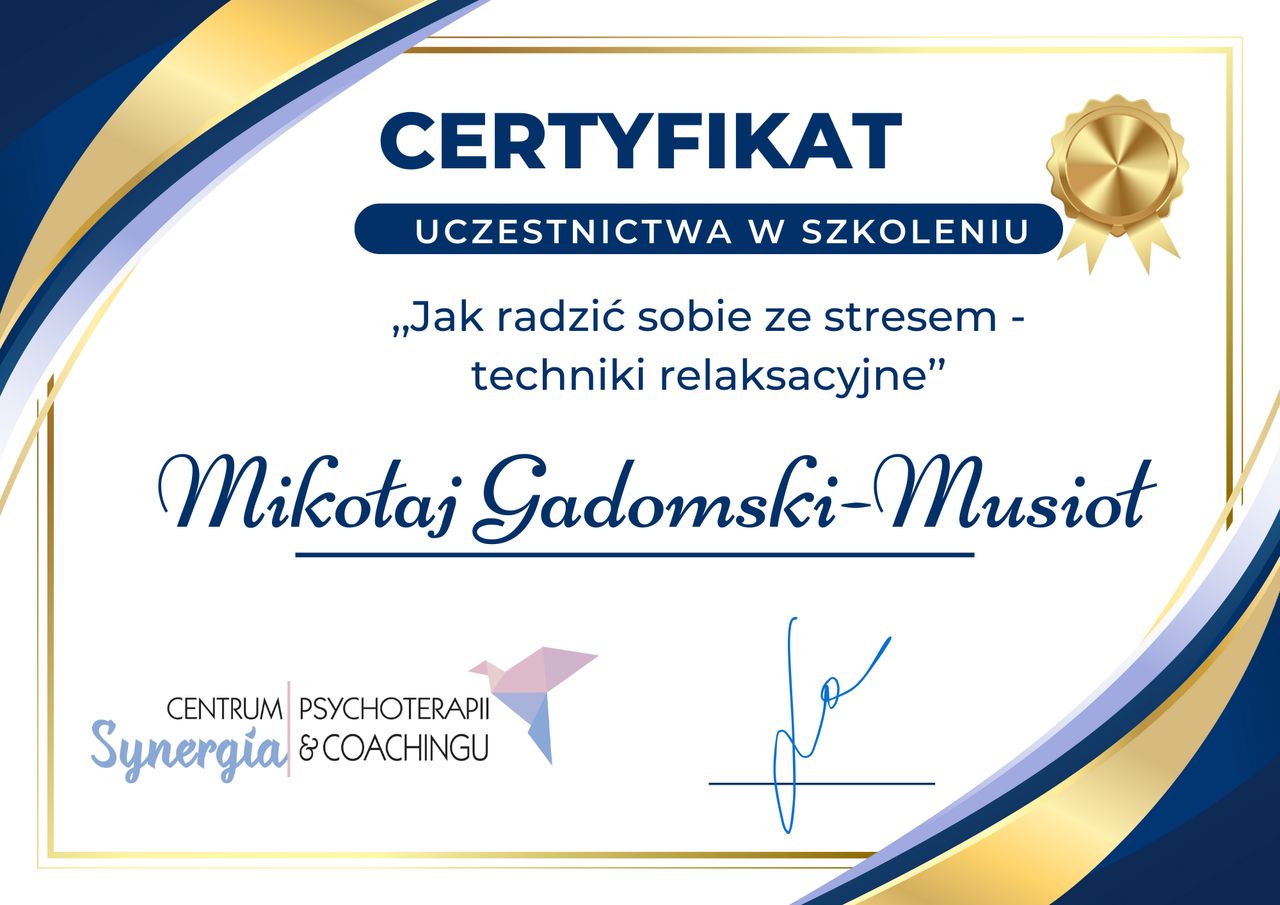 Ukończyłem studia magisterskie z psychologii na Uniwersytecie im. Adama Mickiewicza w Poznaniu oraz podyplomowe z interwencji kryzysowej na Uniwersytecie SWPS w Poznaniu. Obecnie przygotowuję się do szkolenia w zakresie psychoterapii systemowej w Wielkopolskim Towarzystwie Terapii Systemowej.