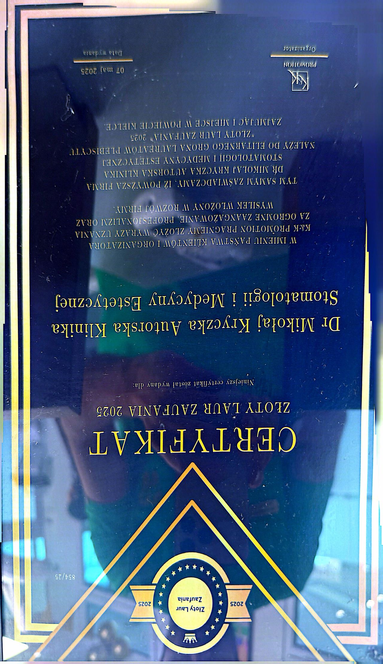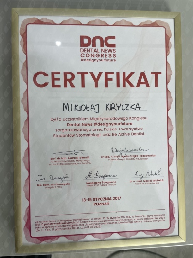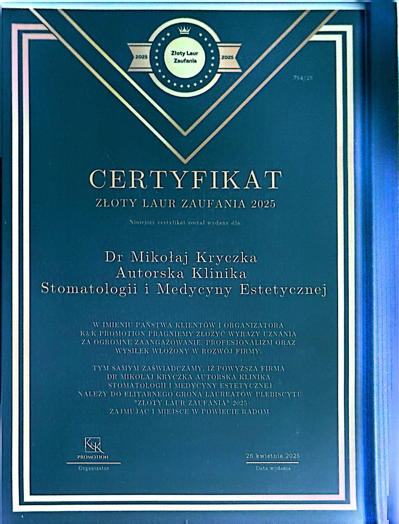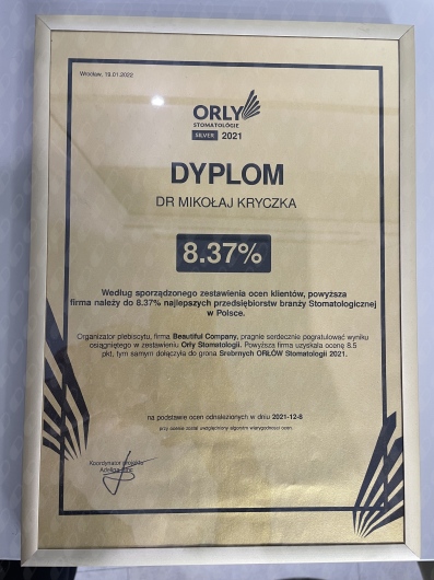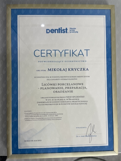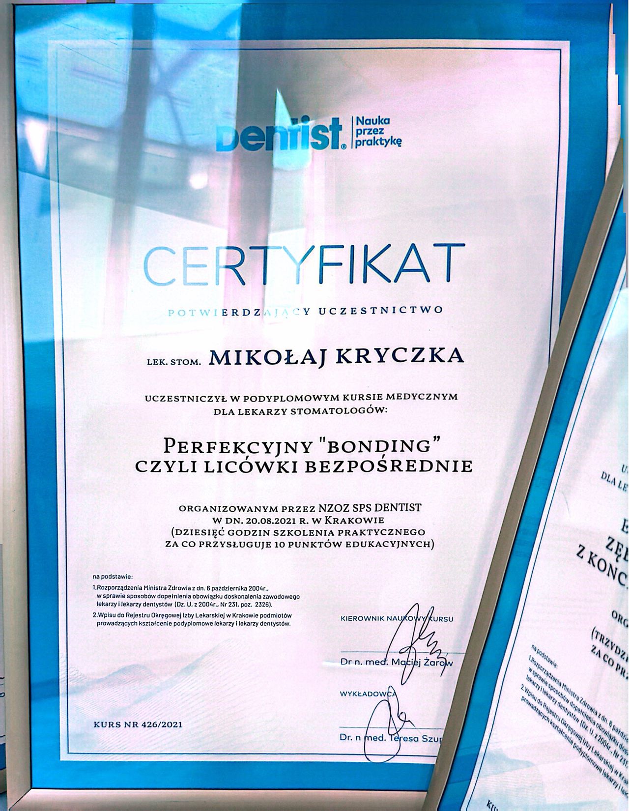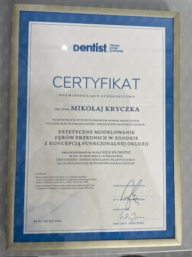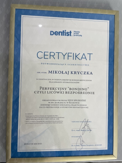 Miałem/miałam przyjemność skorzystać z usług dr Mikołaja Kryczki w zakresie bondingu zębów i mogę z pełnym przekonaniem polecić go jako doskonałego specjalistę. Zabieg został wykonany bardzo precyzyjnie, z dbałością o każdy detal i estetykę uśmiechu. Dr Kryczka dokładnie wyjaśnił cały proces, rozwiał wszelkie wątpliwości i zadbał o komfort na każdym etapie wizyty.