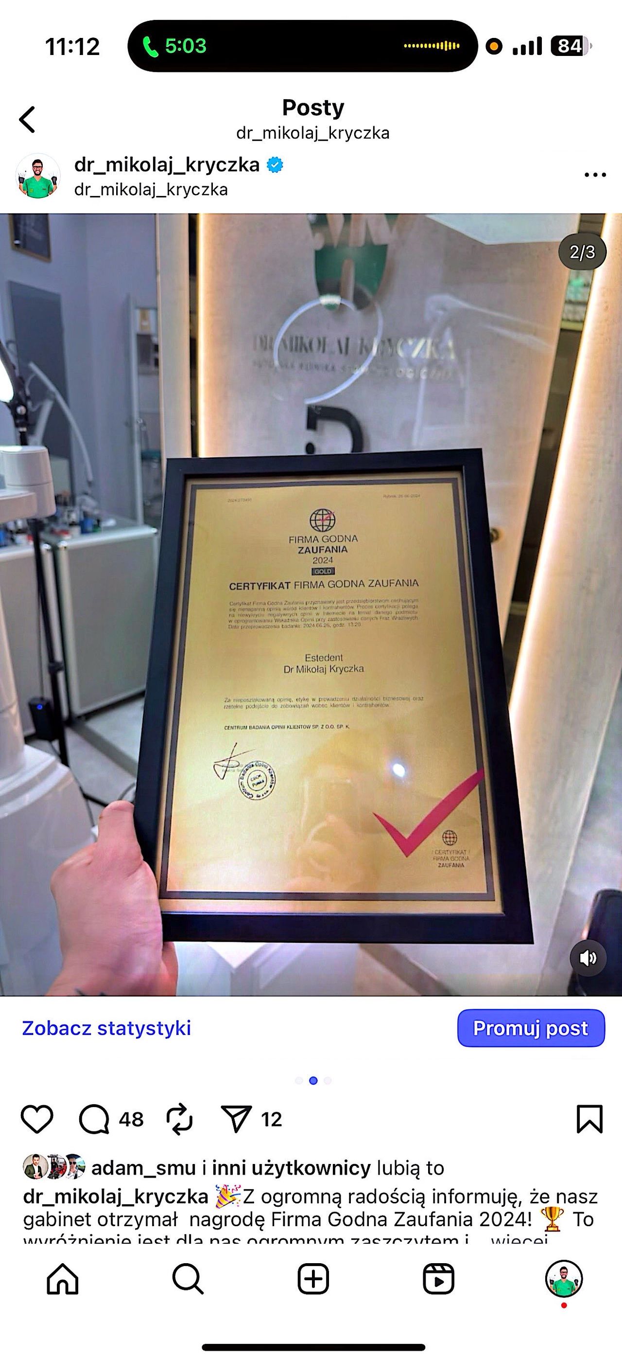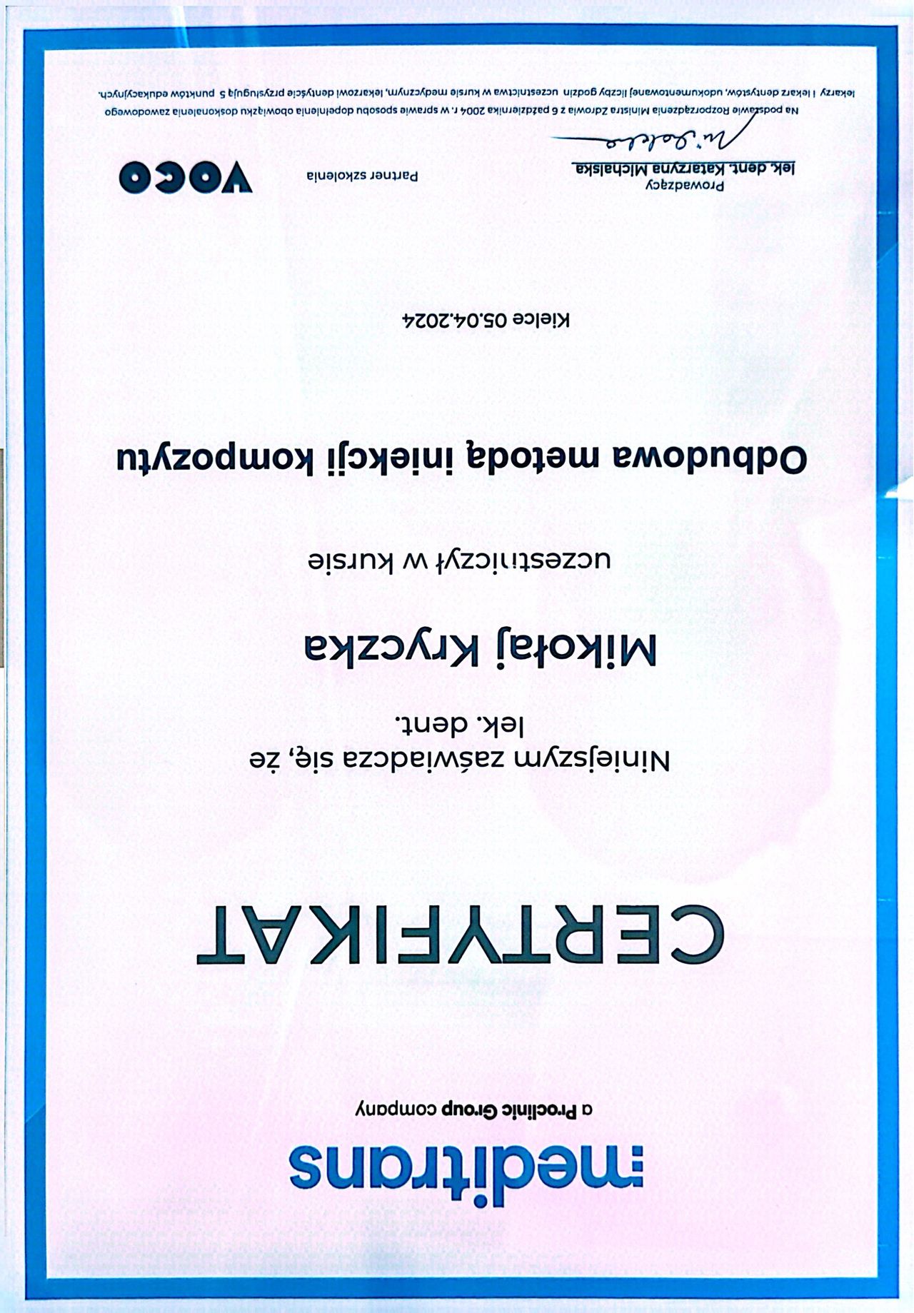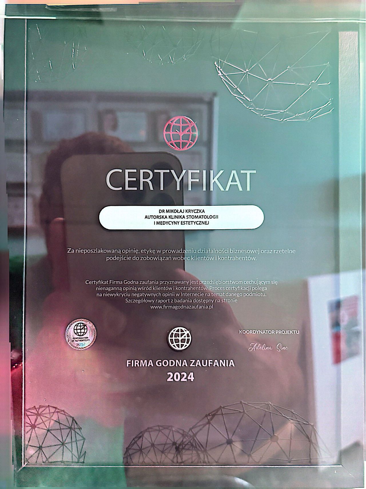 Miałem/miałam przyjemność skorzystać z usług dr Mikołaja Kryczki w zakresie bondingu zębów i mogę z pełnym przekonaniem polecić go jako doskonałego specjalistę. Zabieg został wykonany bardzo precyzyjnie, z dbałością o każdy detal i estetykę uśmiechu. Dr Kryczka dokładnie wyjaśnił cały proces, rozwiał wszelkie wątpliwości i zadbał o komfort na każdym etapie wizyty.