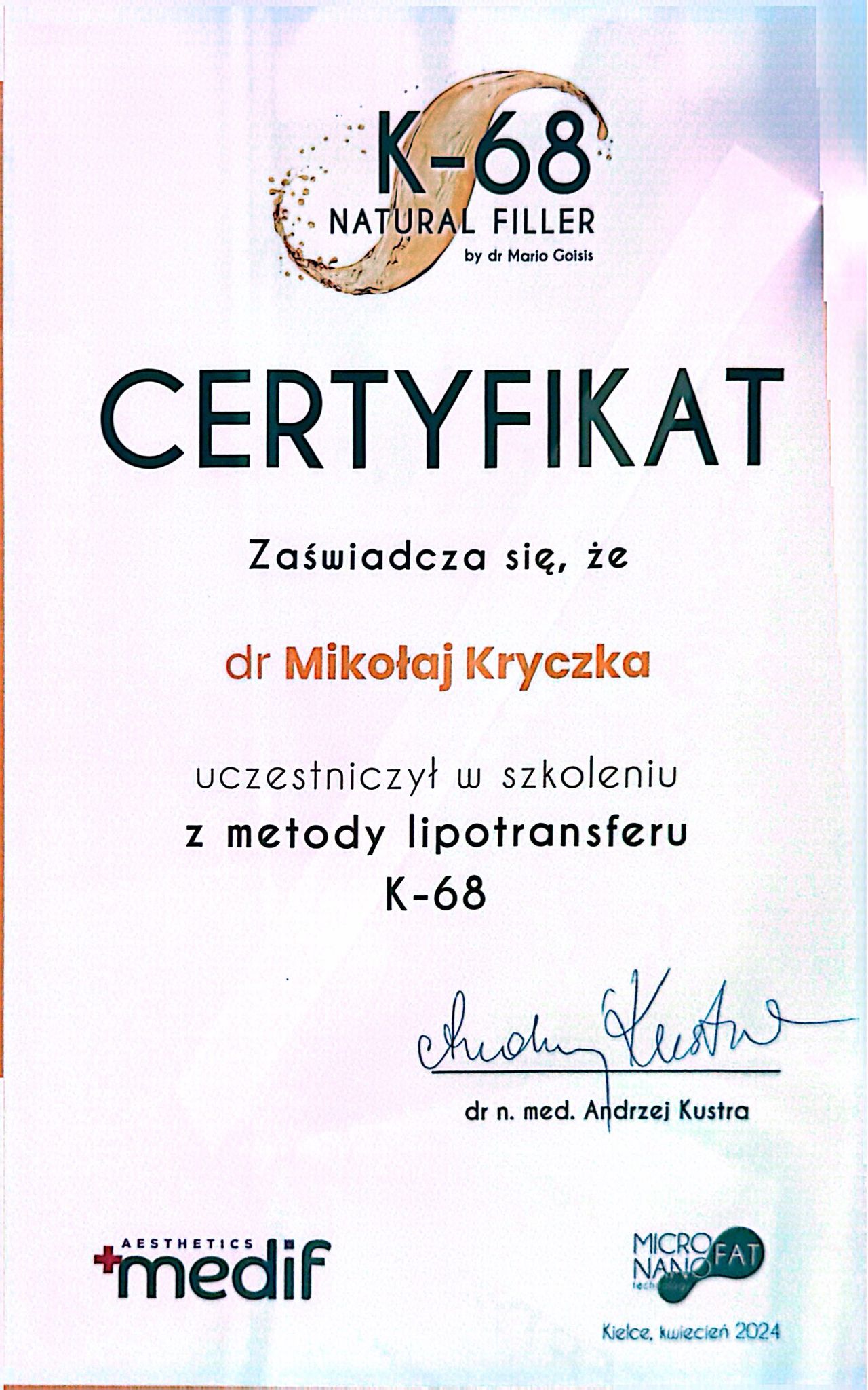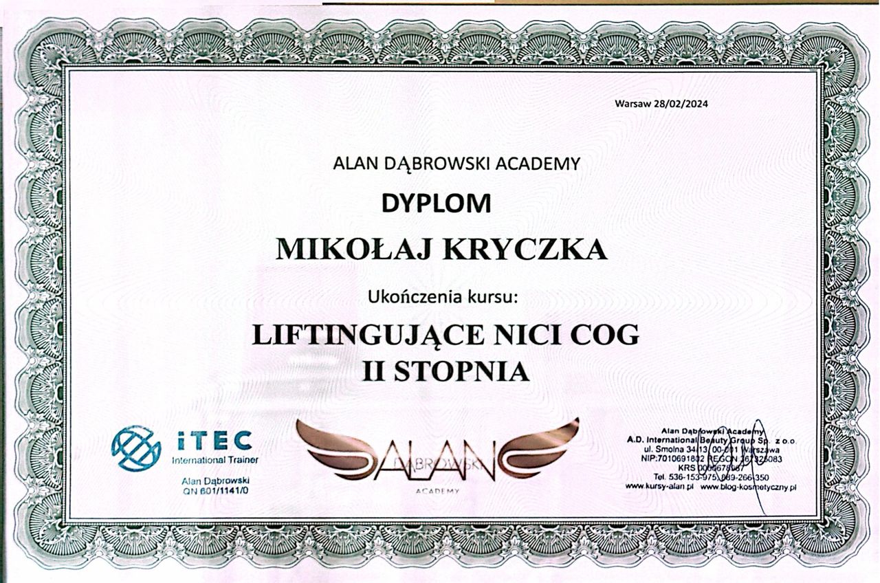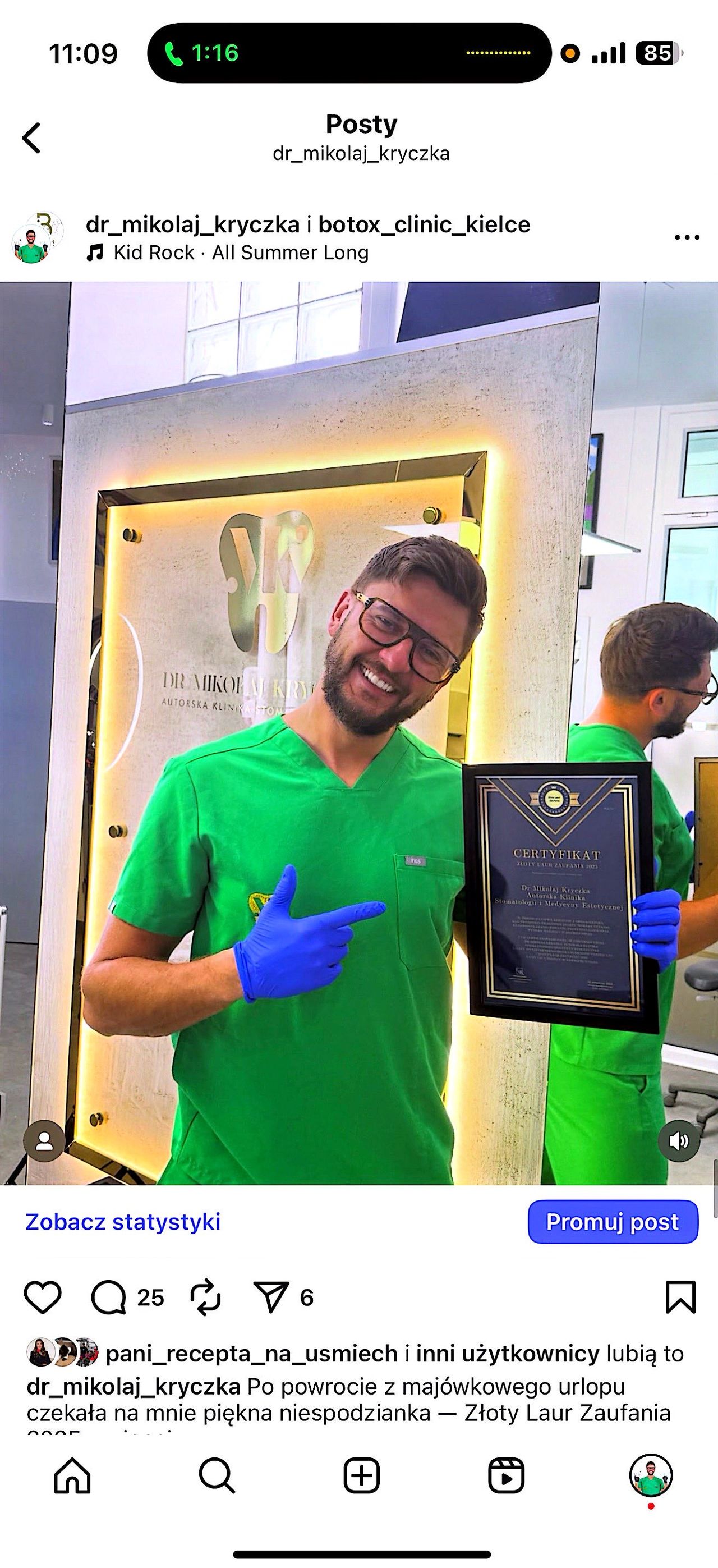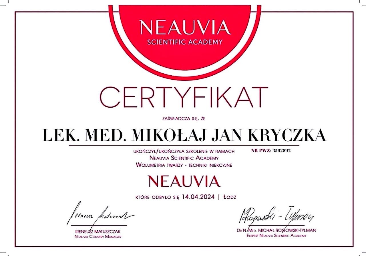 Z całego serca polecam Pana Doktora Mikołaja Kryczkę! Od samego początku wizyty czułam się w pełni zaopiekowana i bardzo komfortowo. Profesjonalizm, wiedza oraz indywidualne podejście do pacjenta sprawiają, że wizyta u Pana Doktora to czysta przyjemność. Wszystko zostało dokładnie wyjaśnione, a efekty zabiegu przeszły moje oczekiwania – naturalne, subtelne, a jednocześnie widoczne. To lekarz, który naprawdę dba o swoich pacjentów i ich potrzeby. Zdecydowanie najlepszy specjalista w tej dziedzinie, którego mogę polecić z czystym sumieniem