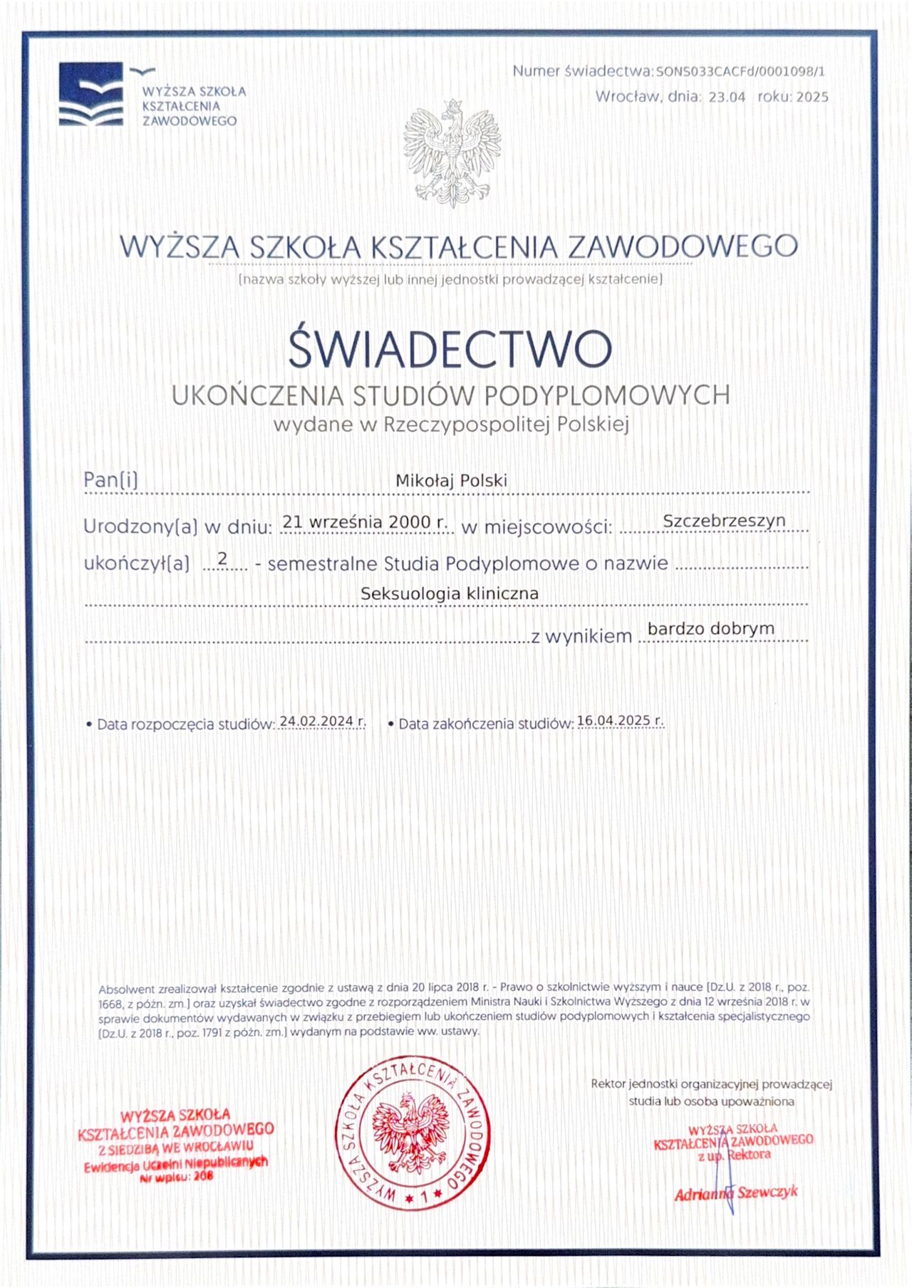 Jestem psychologiem oraz psychologiem - seksuologiem. Ukończyłem studia magisterskie z psychologii na Katolickim Uniwersytecie Lubelskim Jana Pawła II oraz studia podyplomowe z seksuologii klinicznej w Wyższej Szkole Kształcenia Zawodowego.
