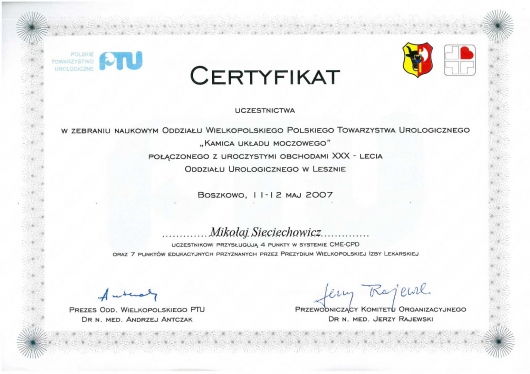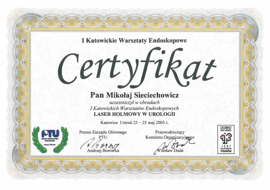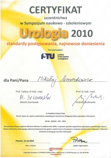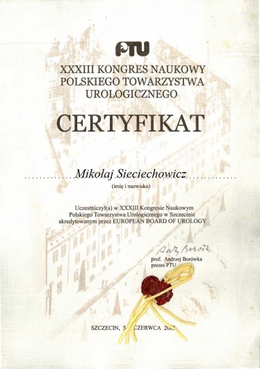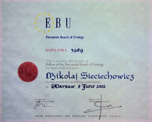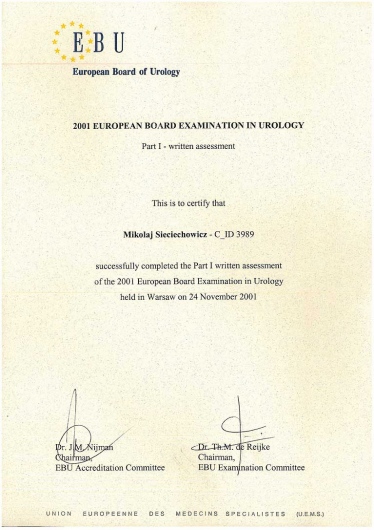 Jestem absolwentem Akademii Medycznej im. Karola Marcinkowskiego w Poznaniu (1990). Staż podyplomowy odbyłem w ramach stypendium fundowanego w Szpitalu Kolejowym w Puszczykowie. Tamże uzyskałem dyplom specjalisty I st. (w starym systemie) z zakresu chirurgii ogólnej pod kierunkiem dr n. med. Michała Grzegorzewicza. Tytuł specjalisty II st. z zakresu urologii pod kierunkiem dr n. med. Macieja Strzyżowskiego uzyskałem na Oddziale Urologicznym Szpitala w Puszczykowie. Następnie pracę zawodową kontynuowałem w Prywatnej Lecznicy Certus w Poznaniu. W latach 2012-2015 pracowałem jako starszy asystent w Klinice Urologi i Onkologii Urologicznej w Poznaniu. Na wszystkich w/w oddziałach wykonywałem zabiegi operacyjne z zakresu urologii i onkologii urologicznej zarówno tradycyjne, jak i endoskopowe. Aktualnie wykonuję zabiegi operacyjne w ramach urologii jednodniowej w prywatnej klinice Medical Prestige w Poznaniu. Posiadam dostęp do pełnoprofilowego oddziału urologicznego, gdzie wykonywane są zabiegi operacyjne z użyciem najnowocześniejszego sprzętu i aparatury medycznej (laser, laparoskopia, endoskopia, ESWL, URS). Posiadam dyplom Fellow of the European Board of Urology (FEBU). Jestem członkiem Polskiego Towarzystwa Urologicznego oraz Europejskiego Towarzystwa Urologicznego. W swojej pracy zawodowej aktywnie uczestniczę w licznych sympozjach naukowych w kraju i za granicą (m.in. USA, Peru, Niemcy).