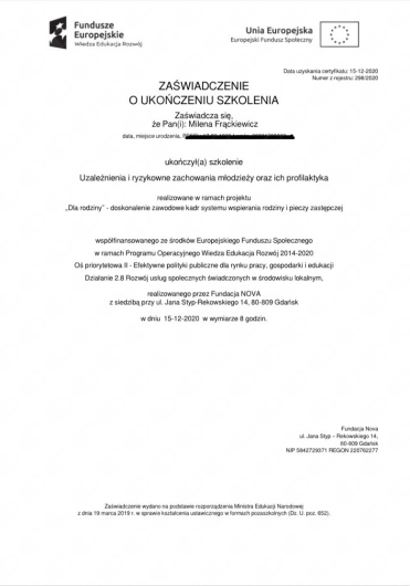 Jestem absolwentką Psychologii na Uniwersytecie Gdańskim. Jestem w trakcie 4-letniego kursu Psychoterapii Poznawczo-Behawioralnej w Centrum CBT, który posiada rekomendację Polskiego Towarzystwa Terapii Poznawczo-Behawioralnej. Ukończyłam szkolenie Terapii Skoncentrowanej na Rozwiązaniach. Posiadam również certyfikat Trenera Umiejętności Społecznych. Swoją pracę poddaję regularnej superwizji. Pracuję z osobami dorosłymi, dziećmi i młodzieżą oraz z ich rodzicami. Doświadczenie w diagnozowaniu i opiniowaniu, pozwala mi na skuteczne rozpoznanie problemu i wybranie dalszej drogi wsparcia. Posiadam również wiedzę z zakresu seksuologii klinicznej, którą wykorzystuję podczas konsultacji. Nie jest mi obca praca z młodzieżą niedostosowaną społecznie. Mam również doświadczenie w pracy z rodzinami zastępczymi oraz adopcyjnymi. Moja przestrzeń jest otwarta dla osób LGBT+. Szczególnie bliska jest mi praca terapeutyczna z pacjentami z zaburzeniami lękowymi, depresyjnymi, trudnością w zakresie regulacji emocji, nieadekwatną samooceną, wysoką wrażliwością WWO. Oferuję diagnozę osobowości testem MMPI-2. W swojej pracy opieram się na założeniu, że moją rolą jest pomóc odkryć pacjentowi zasoby, które posiada, do radzenia sobie z trudnościami. Zależy mi na stworzeniu bezpiecznej, komfortowej przestrzeni, opartej na zrozumieniu i zaufaniu, w której wspólnie będziemy mogli pracować nad poprawą jakości życia. Zapraszam do kontaktu. Chętnie odpowiem na pytania i rozwieje wątpliwości. Serdecznie zapraszam także na spotkanie - jestem tu, by pomóc.