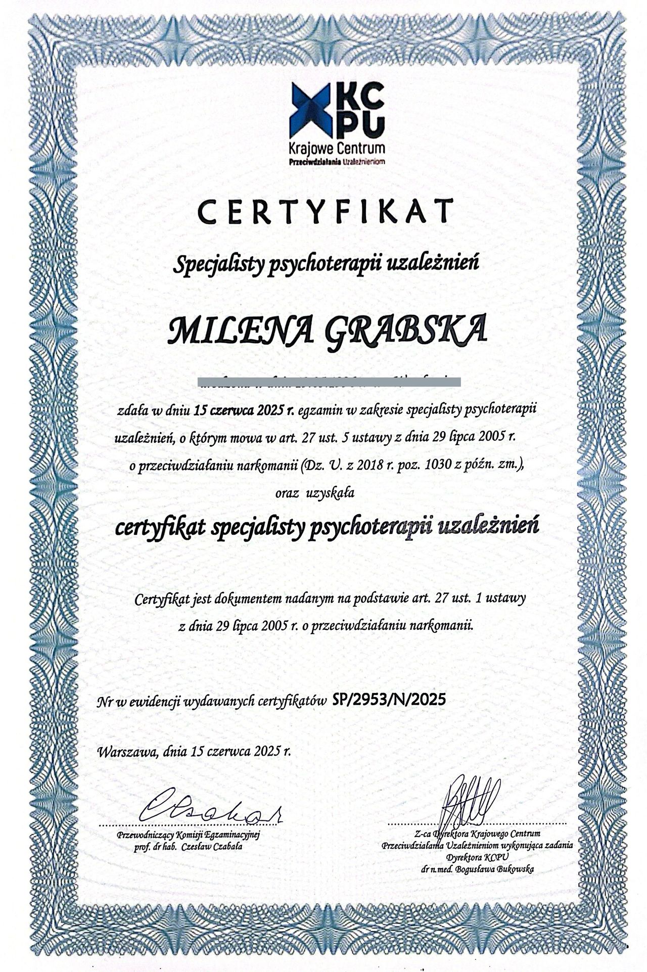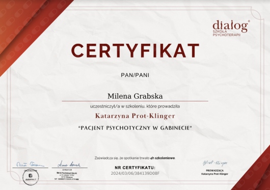 Jaki jest zakres porad oferowanych przez Milena Grabska?Milena Grabska to psycholog, psychoterapeuta certyfikowany. Na podstawie swojego doświadczenia i wykształcenia Milena Grabska oferuje usługi takie jak: Konsultacja psychologiczna, terapia uzależnień, Konsultacja pierwszorazowa, Konsultacja psychologiczna online.