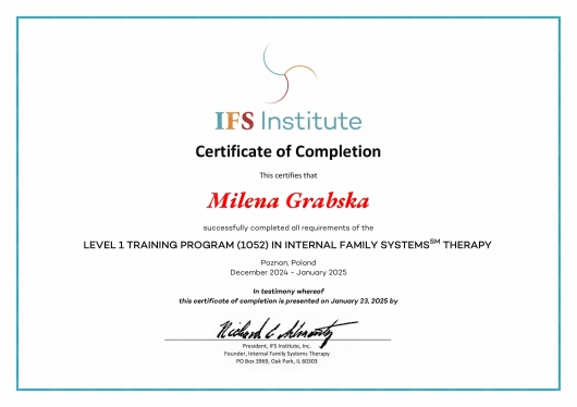 Jestem psycholożką i psychoterapeutką uzależnień (certyfikat specjalisty psychoterapii uzależnień nr SP/2953/N/2025). W swojej pracy łączę solidne przygotowanie kliniczne z podejściem IFS – Modelem Wewnętrznej Rodziny (ukończony Poziom 1 ścieżki szkoleniowej IFS). To połączenie pozwala mi patrzeć na uzależnienie szerzej niż wyłącznie przez pryzmat objawu czy zachowania do zatrzymania.