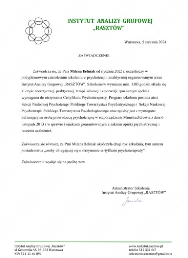 Jestem psycholożką i psychoterapeutką w trakcie 4-letniego Szkolenia w IAG „Rasztów”, ośrodku uznanym przez NFZ oraz rekomendowanym przez Polskie Towarzystwo Psychologiczne oraz posiadające atest Polskiego Towarzystwa Psychiatrycznego.