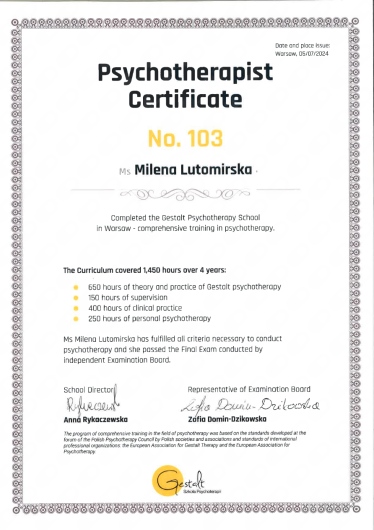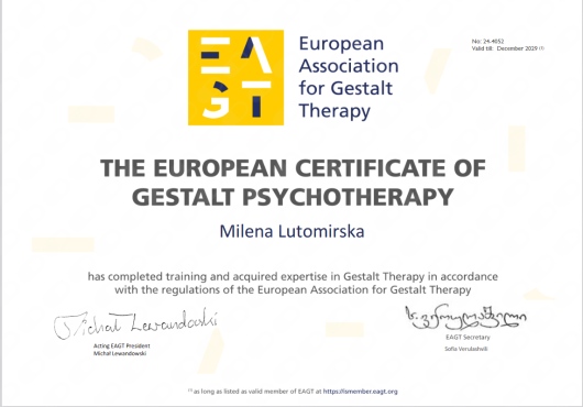 Skończyłam czteroletnie szkolenie psychoterapeutyczne w nurcie Gestalt. Posiadam certyfikat EAGT - European Association of Gestalt Therapy. Jestem członkiem PTPG (Polskie Towarzystwo Psychoterapii Gestalt) i EAGT. Stale superwizuję moją pracę, obecnie u: Krystyny Waszkowskiej-Wójcik, Anny Bal i Małgorzaty Bułhak. Mam za sobą łącznie ponad 6 lat terapii własnej. Doświadczenie zawodowe zdobywałam: na stażu klinicznym na Oddziale Dziennym Psychiatrycznym Praga-Północ w Warszawie oraz w pracy w gabinecie w Warszawie i gabinecie online.
