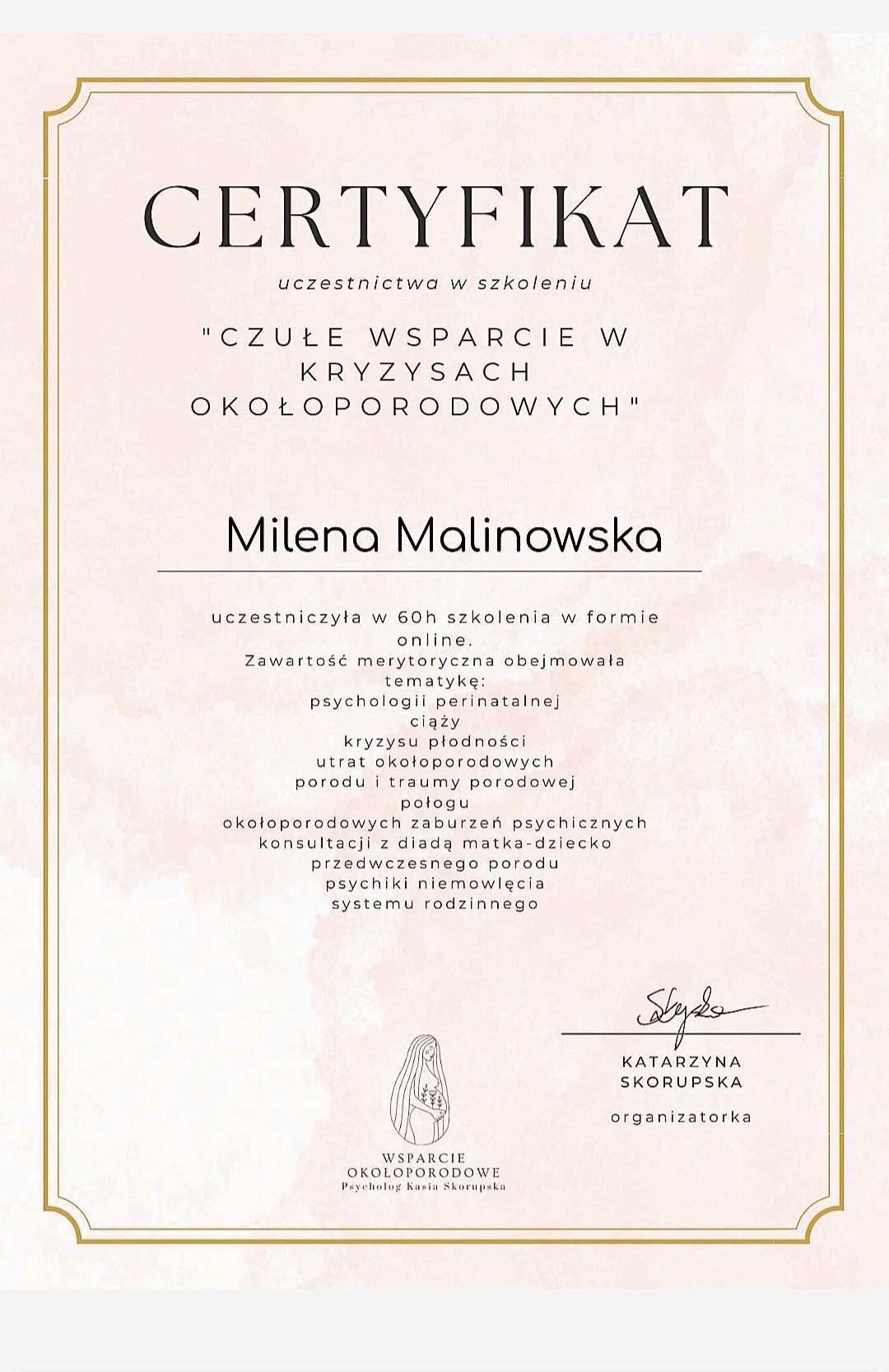 Z Panią Mileną miałam okazję mieć styczność po moim porodzie w Szpitalu Bielańskim. Niezwykle zaangażowana, kompetentna i co bardzo ważne , ciepła osoba. Wsparcie Pani Mileny było dla mnie nieocenione, niesamowicie pomogło mi podczas moich pierwszych dni jako mama. Czułam się zaopiekowana i zrozumiana, przy każdej rozmowie poświęciła mi tyle czasu ile potrzebowałam. Serdecznie polecam!