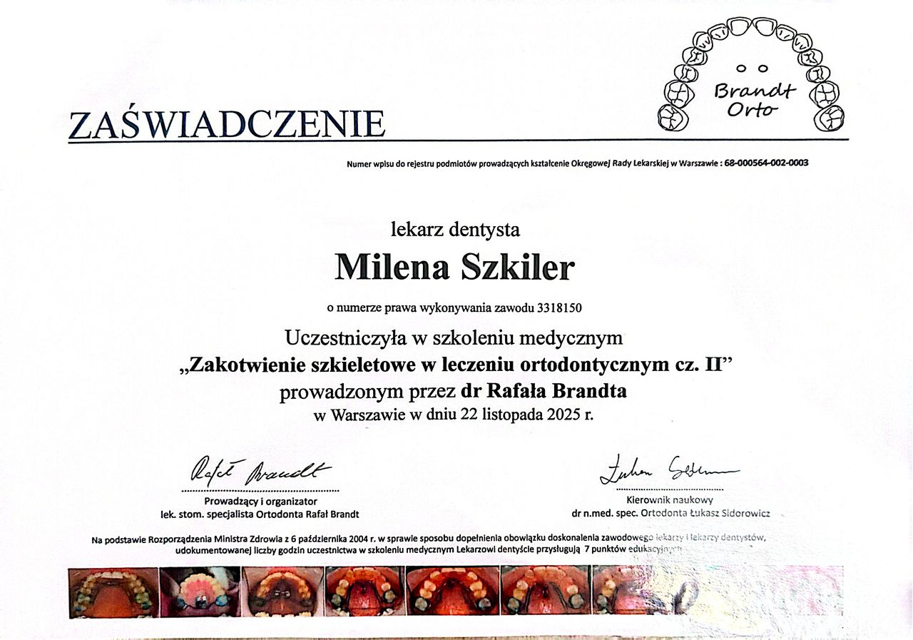 Regularnie uczestniczę w kursach i szkoleniach, aby stale podnosić swoje kwalifikacje i stosować sprawdzone, nowoczesne rozwiązania. Moim celem jest nie tylko uzyskanie prawidłowego zgryzu, ale także pięknego, zdrowego uśmiechu oraz długotrwałych efektów leczenia.