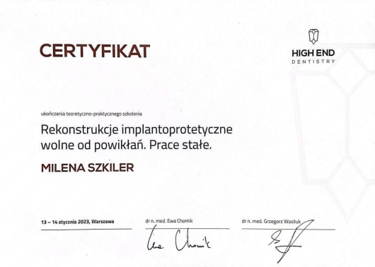 Jaki jest zakres porad oferowanych przez Milena Szkiler?Milena Szkiler to stomatolog. Na podstawie swojego doświadczenia i wykształcenia Milena Szkiler oferuje usługi takie jak: Konsultacja stomatologiczna, konsultacja stomatologiczna (pierwsza wizyta), konsultacja protetyczna, protezy, korony cyrkonowe, korony pełnoceramiczne, korony porcelanowe, korony na implantach, leczenie kanałowe, leczenie kanałowe pod mikroskopem.