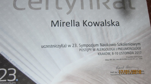Systematycznie uczestniczę kilka razy do roku w konferencjach szkoleniowych,sympozjach,warsztatach Polskiego Towarzystwa Alergologicznego.