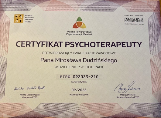 Jestem psychologiem, certyfikowanym psychoterapeutą i superwizorem psychoterapii Gestalt. Ukończyłem psychologię na Uniwersytecie Jagiellońskim oraz 4 letnią Szkołę Psychoterapii i Treningu Grupowego w Instytucie Integralnej Psychoterapii Gestalt, akredytowaną przez Polskiego Towarzystwo Psychologiczne (PTP), Europejskie Stowarzyszenie Psychoterapii (EAP).