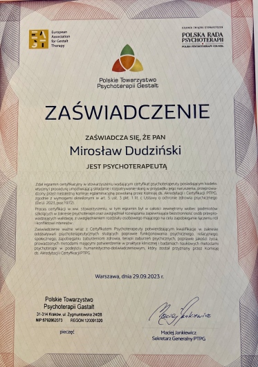Jaki jest zakres porad oferowanych przez Mirosław Dudziński?Mirosław Dudziński to psycholog, psychoterapeuta certyfikowany. Na podstawie swojego doświadczenia i wykształcenia Mirosław Dudziński oferuje usługi takie jak: Konsultacja psychologiczna, konsultacja psychoterapeutyczna dla par (pierwsza wizyta), psychoterapia Gestalt, psychoterapia psychodynamiczna, Konsultacja online (pierwsza wizyta), coaching online.