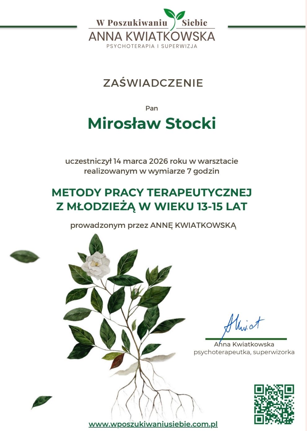 Jestem psychoterapeutą w trakcie specjalistycznego czteroletniego szkolenia z psychoterapii w Collegium Verum (III rok). Spełniłem wszystkie wymogi uczelniane i prawne dające prawo do prowadzenia praktyki psychoterapeutycznej pod stałą superwizją. Jednocześnie jestem w procesie certyfikacji w Polsko-Niemieckim Instytucie Psychoterapii Integralnej. Posiadam certyfikat trenera umiejętności społecznych.