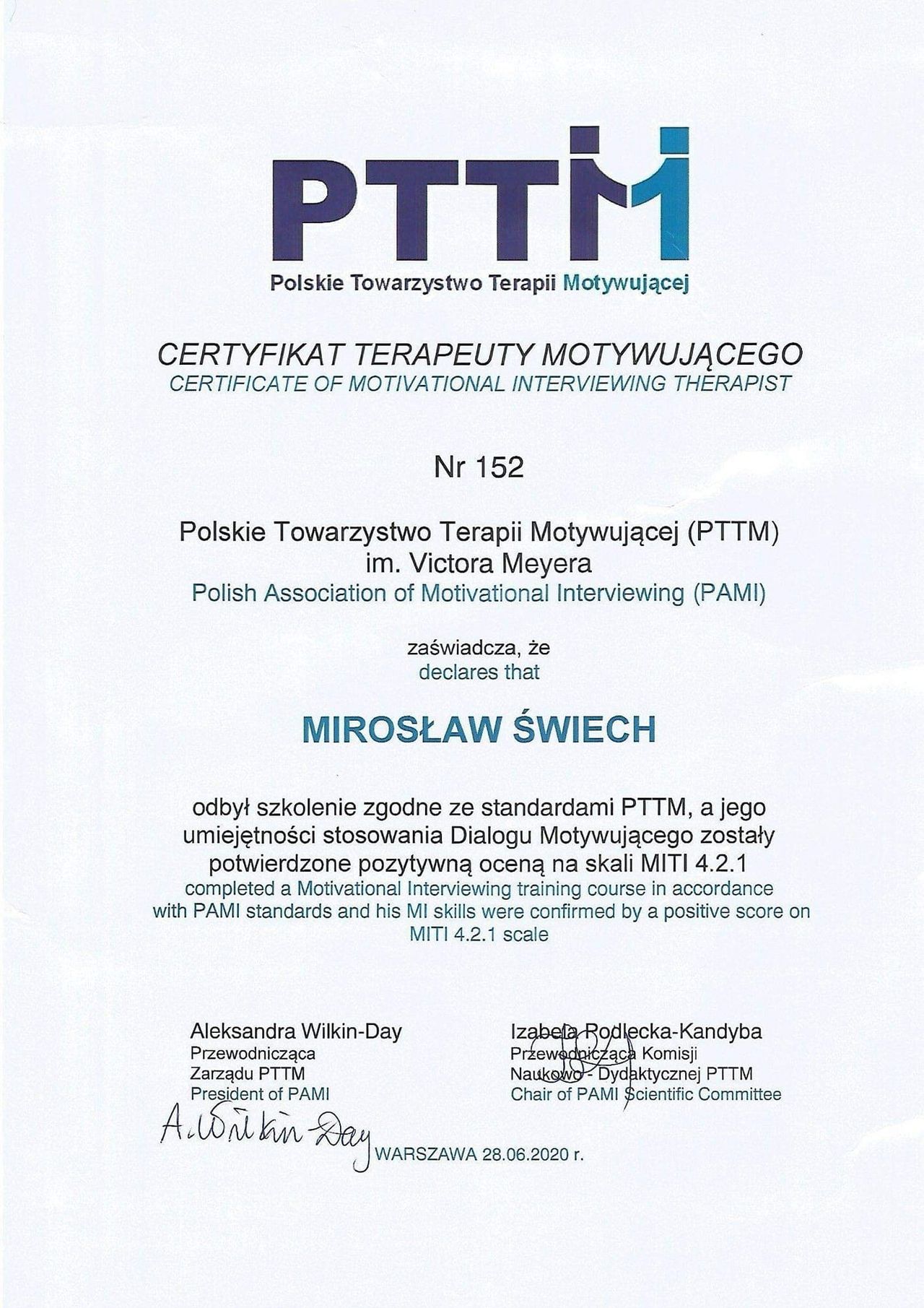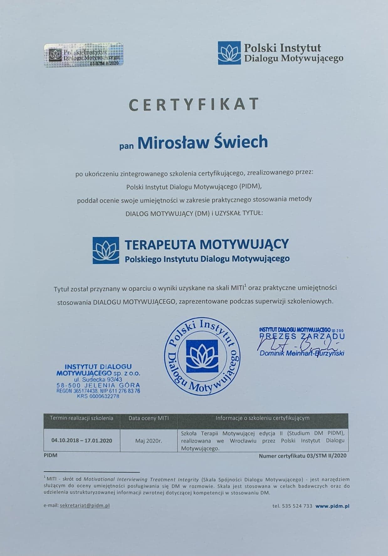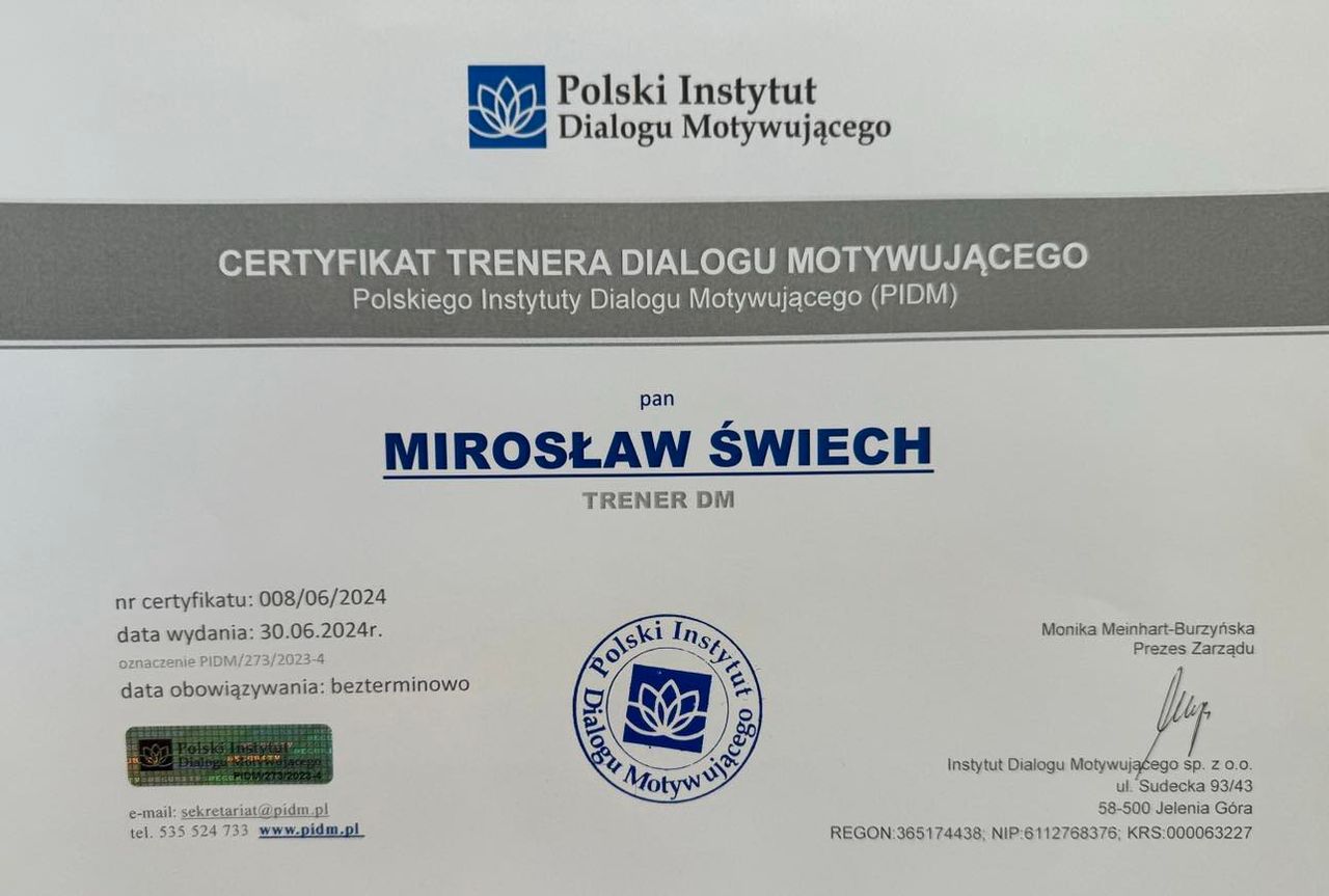 Po kursie trenerskim odbytym w 2024 roku uzyskałem Certyfikat Trenera Dialogu Motywującego Polskiego Instytutu Dialogu Motywującego.