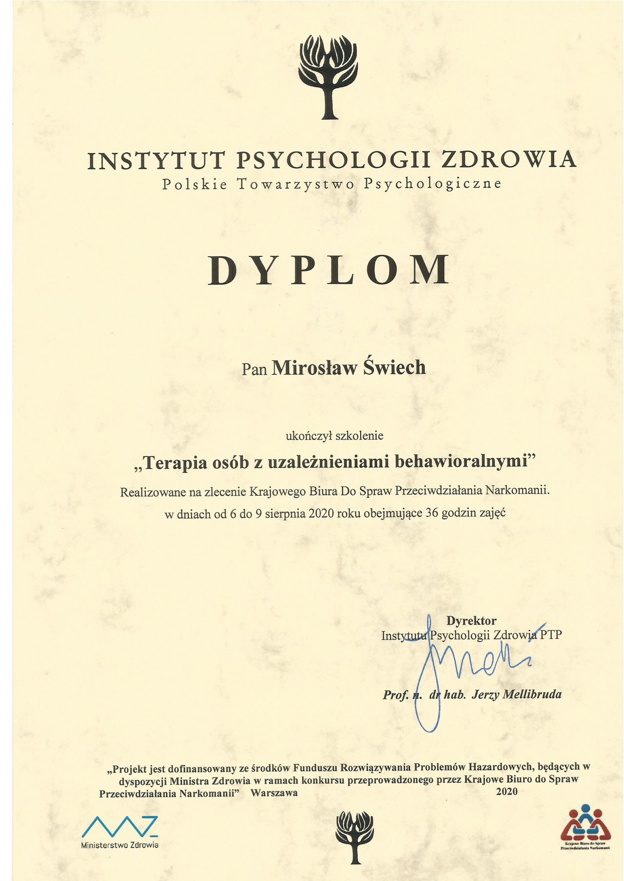 Uczestniczyłem w szkoleniu z zakresu psychoterapii uzależnień behawioralnych zorganizowanym przez Instytut Psychologii Zdrowia Polskiego Towarzystwa Psychologicznego.