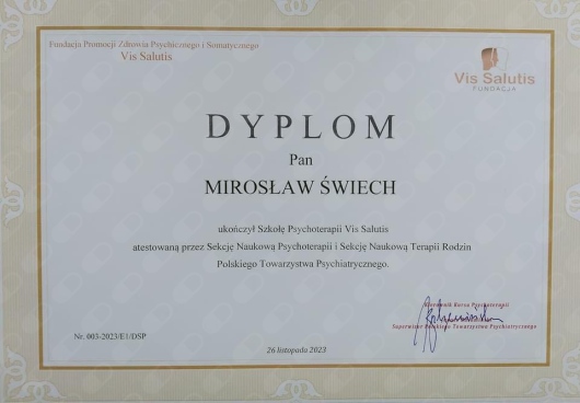 Ukończyłem 5 letni Kurs Psychoterapii w podejściu integracyjnym w Szkole Psychoterapii Vis Salutis atestowanej przez Sekcję Naukową Psychoterapii i Sekcję Naukową Terapii Rodzin Polskiego Towarzystwa Psychiatrycznego.