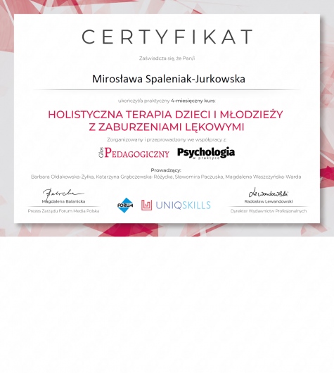 Trafiłam do Pani Mirosławy Spaleniak-Jurkowskiej w bardzo trudnym momencie swojego życia. Przeszłam wcześniej przez kilku specjalistów, ale dopiero tutaj poczułam prawdziwą zmianę. Nasza wspólna praca trwała ponad półtora roku i mogę śmiało powiedzieć, że to był czas, który całkowicie odmienił moje życie.