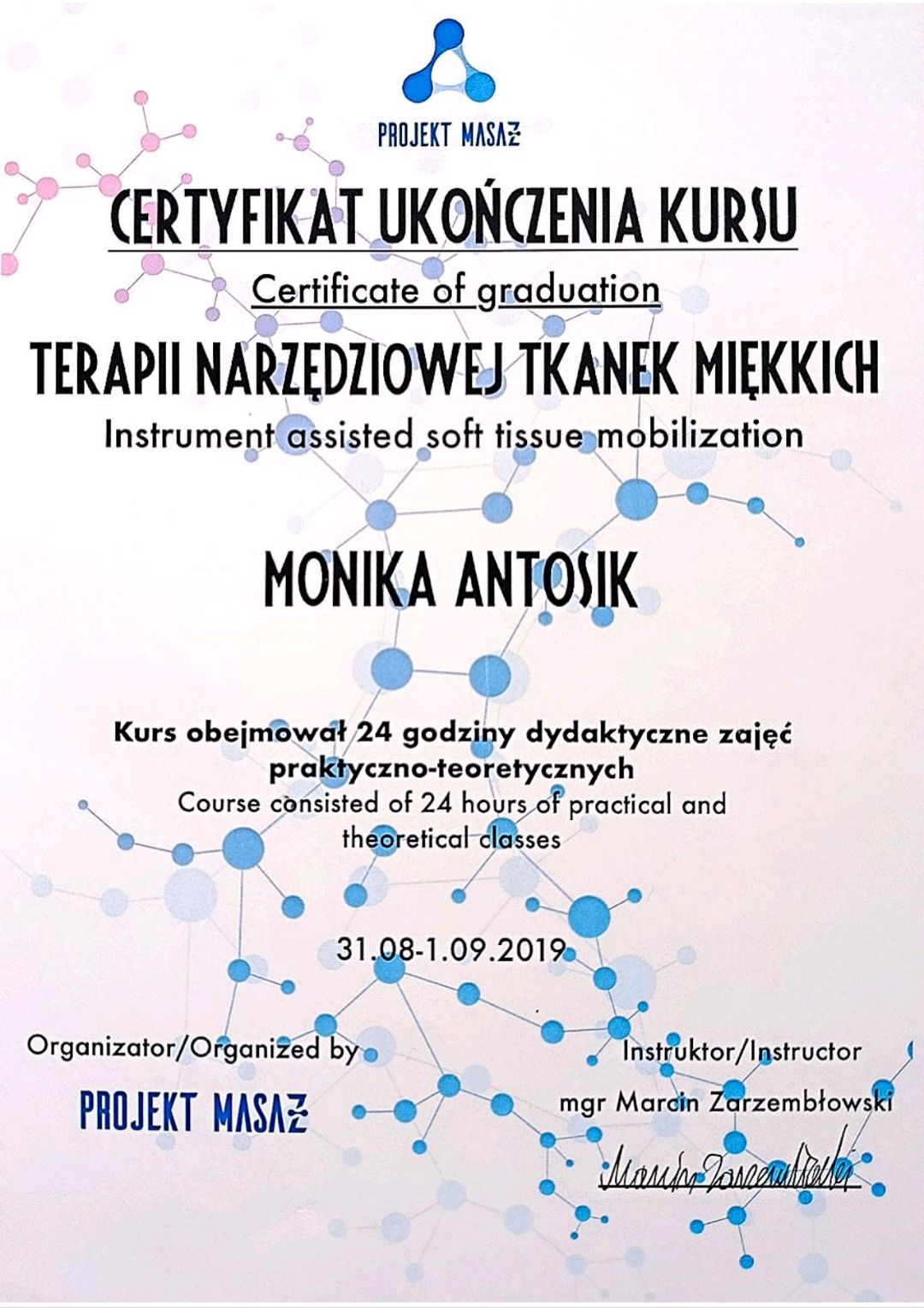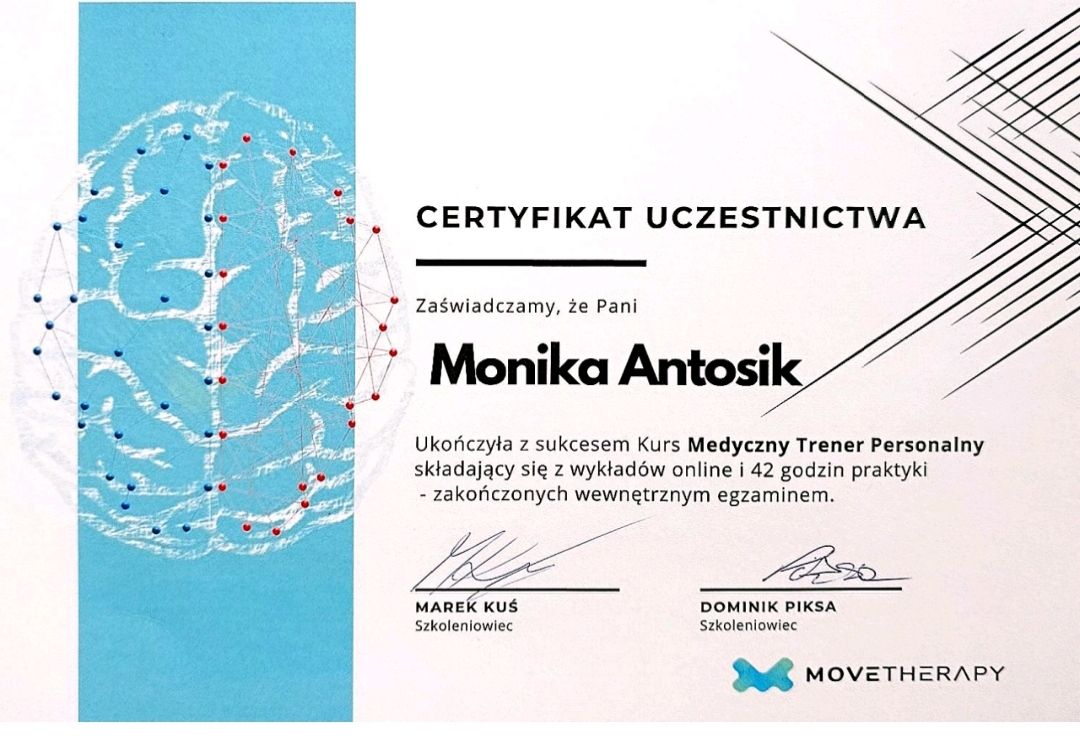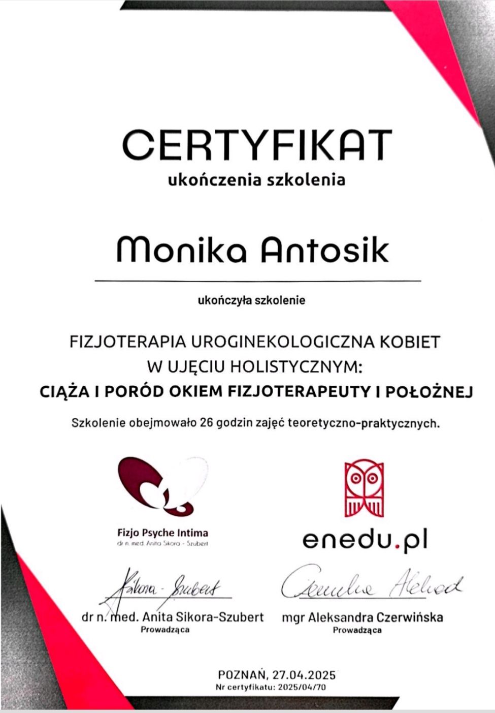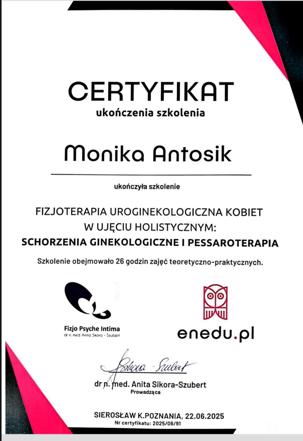 Jaki jest zakres porad oferowanych przez Monika Antosik?Monika Antosik to fizjoterapeuta. Na podstawie swojego doświadczenia i wykształcenia Monika Antosik oferuje usługi takie jak: konsultacja fizjoterapeutyczna, fizjoterapia uroginekologiczna, fizjoterapia uroginekologiczna - bóle miesiączkowe i endometrioza, fizjoterapia kobiet w ciąży / fizjoterapia okołoporodowa, Terapia blizny, Terapia blizny po cesarskim cięciu, Konsultacja fizjoterapeutyczna po zabiegach chirurgii plastycznej, masaż kobiet w ciąży, Fizjoterapia pourazowa, Trening medyczny.