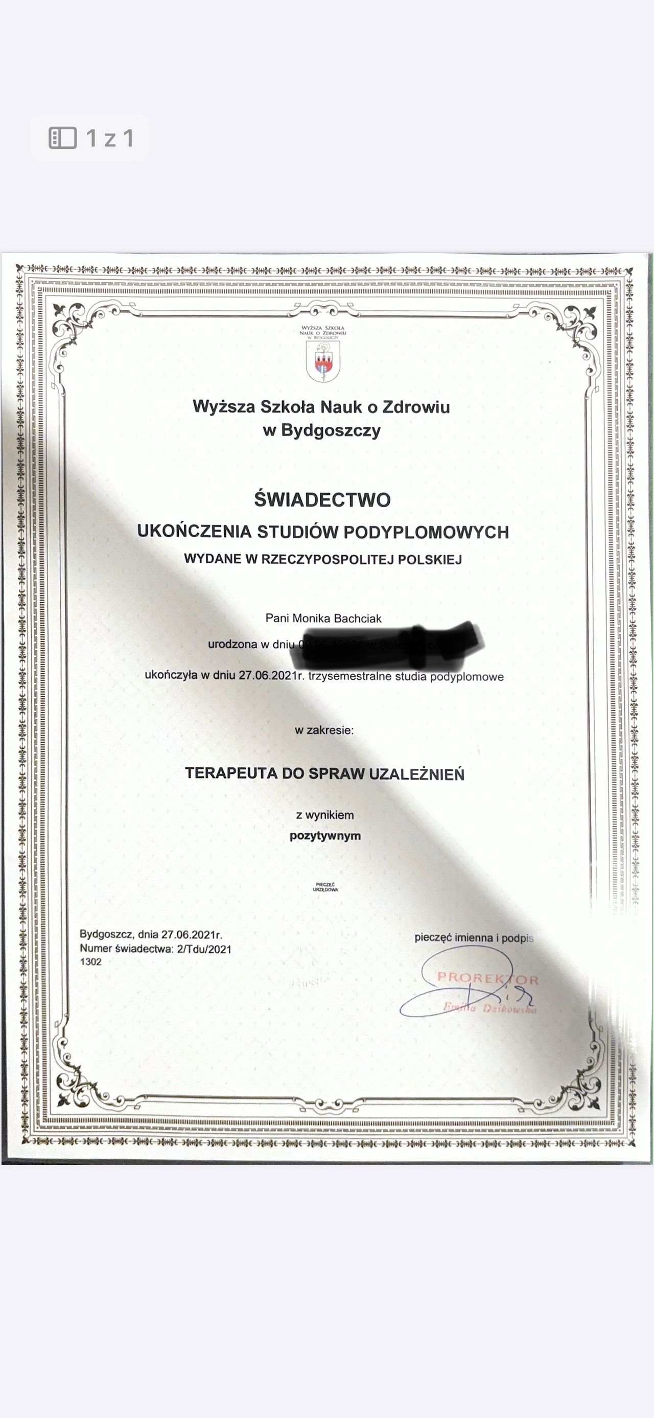 W 2017 roku ukończyłam stacjonarne, pięcioletnie studia psychologiczne. Następnie zdobyłam kwalifikacje na studiach podyplomowych w zakresie terapii uzależnień, co pozwala mi wspierać również osoby zmagające się z trudnościami w pokonywaniu nałogów.