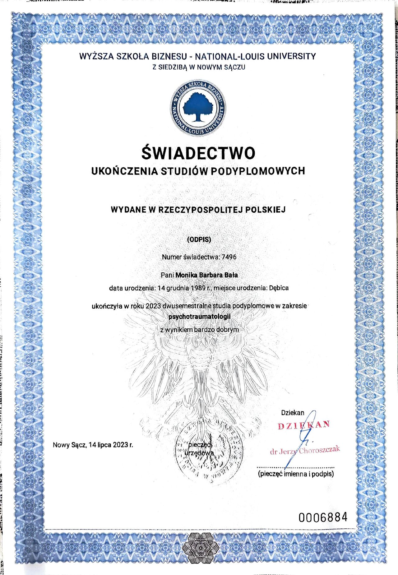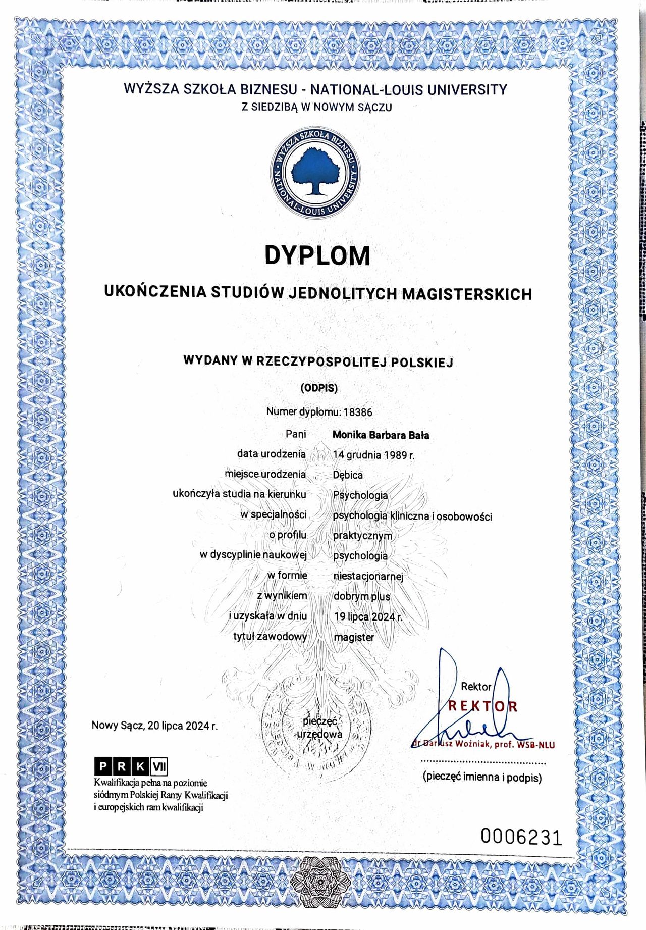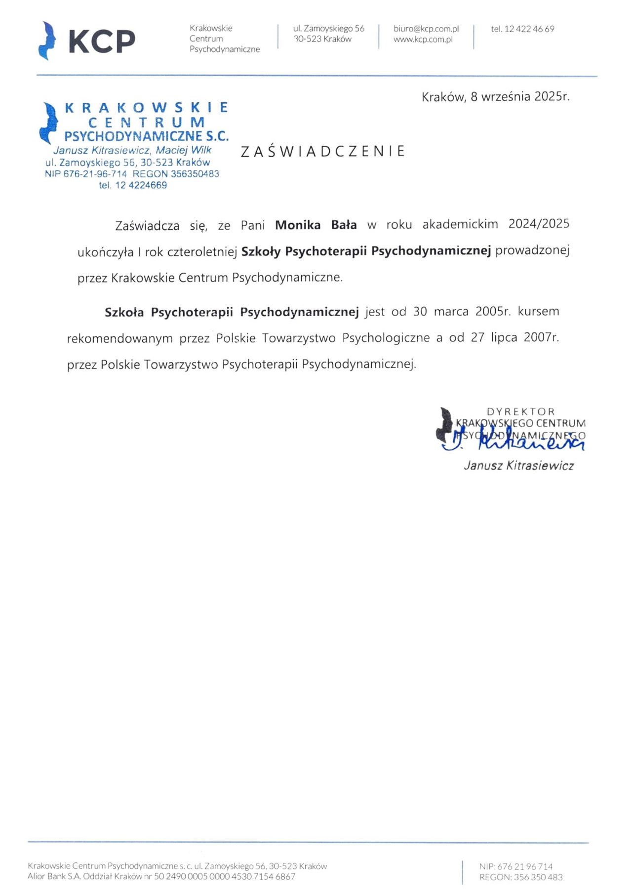jestem psychologiem, psychotraumatologiem oraz psychoterapeutą w trakcie 4-letniego całościowego kursu psychoterapeutycznego w Krakowskim Centrum Psychodynamicznym rekomendowanym przez Polskie Towarzystwo Psychologiczne, a także Polskie Towarzystwo Psychoterapii Psychodynamicznej.