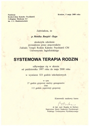 Dodatkowo posiadam kwalifikacje uprawniające mnie do prowadzenia terapii par, małżeństw i rodzin potwierdzone ukończonym 3-letnim kursem terapii rodzin odbytym w Zakładzie Terapii Rodzin Collegium Medicum UJ.